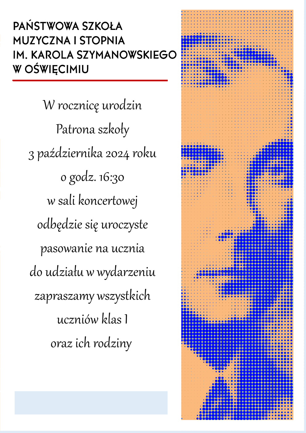 W rocznicę urodzin Patrona szkoły 3 października 2024 roku o godz. 16:30 w sali koncertowej odbędzie się uroczyste pasowanie na ucznia. Do udziału w wydarzeniu zapraszamy wszystkich uczniów klas I oraz ich rodziny.