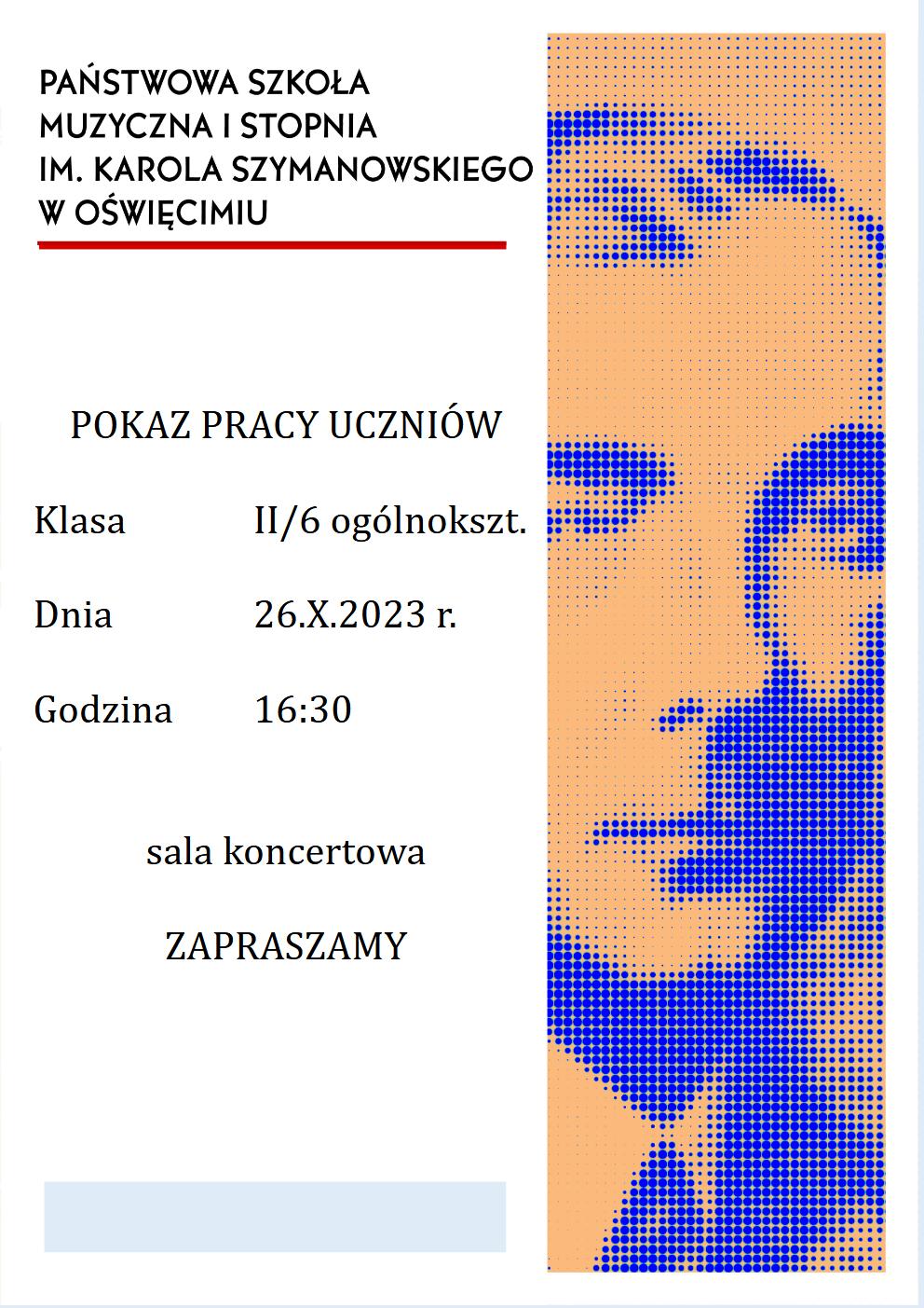 Pokaz pracy klasy II/6 - ogólnokształcącej odbędzie się 26 października 2023 r. o godz. 16:30 w sali koncertowej. Serdecznie zapraszamy.