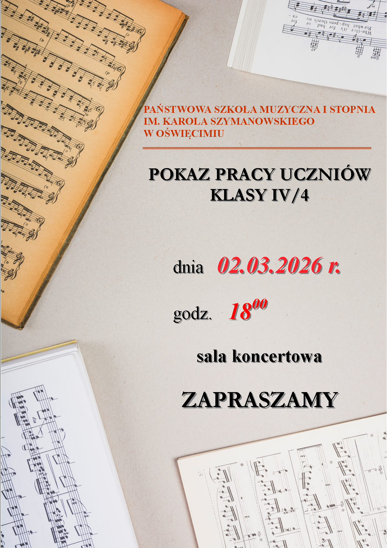 Zapraszamy uczniów szkoły wraz z bliskimi na pokaz pracy w wykonaniu uczniów klasy czwartej czteroletniej, który odbędzie się 2 marca 2026 r. w sali koncertowej o godz. 18:00.