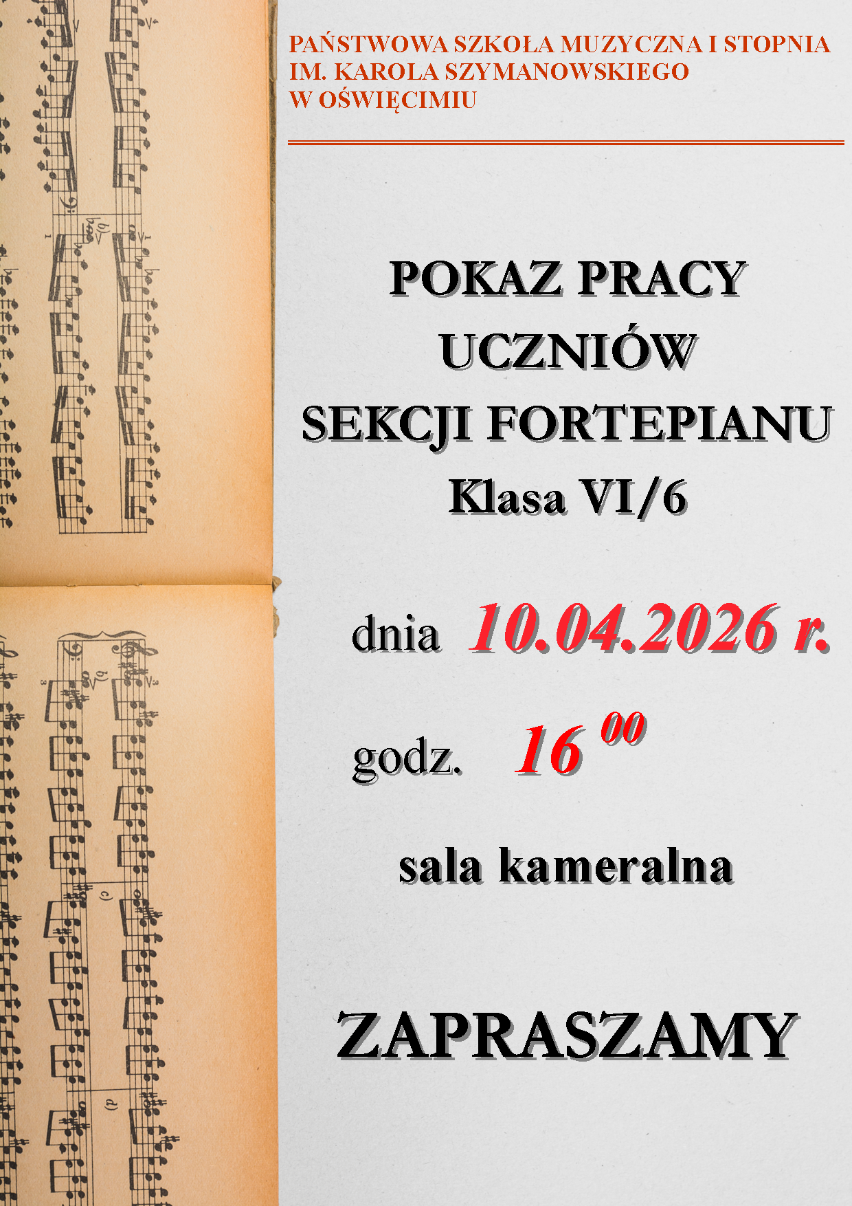Serdecznie zapraszamy uczniów szkoły wraz z bliskimi na pokaz pracy sekcji fortepianu w wykonaniu uczniów klasy szóstej sześcioletniej, który odbędzie się 10 kwietnia 2026 r. o godz. 1600 w sali kameralnej.