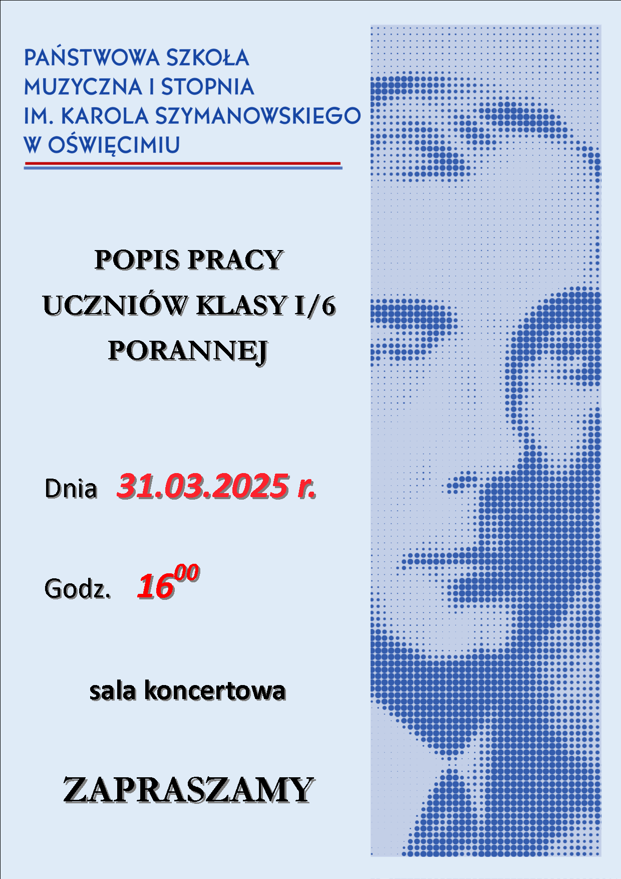 Zapraszamy uczniów szkoły wraz z bliskimi na pokaz pracy w wykonaniu uczniów klasy pierwszej porannej, który odbędzie się 31 marca 2025 r. w sali koncertowej o godz. 16:00