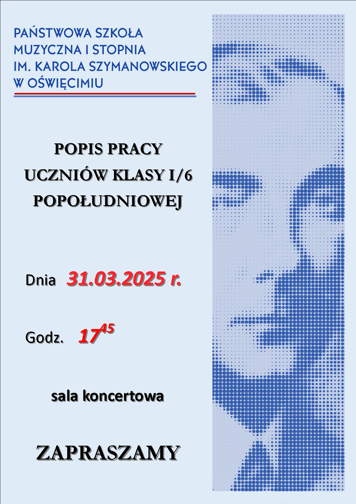 Zapraszamy uczniów szkoły wraz z bliskimi na pokaz pracy w wykonaniu uczniów klasy pierwszej popołudniowej, który odbędzie się 31 marca 2025 r. w sali koncertowej o godz. 17:45