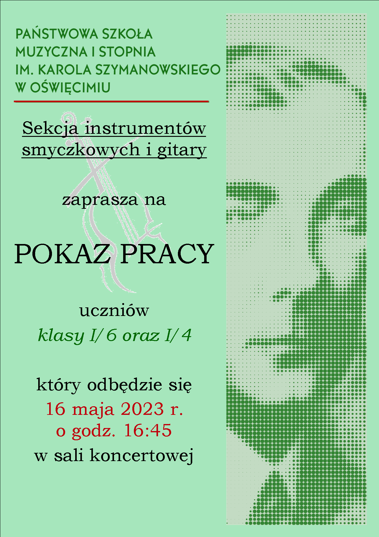 Sekcja instrumentów smyczkowych i gitary zaprasza na pokaz pracy uczniów klas I/6 i I/4. Odbędzie się on 18 maja 2023 r. o godz. 17:00 w sali koncertowej.