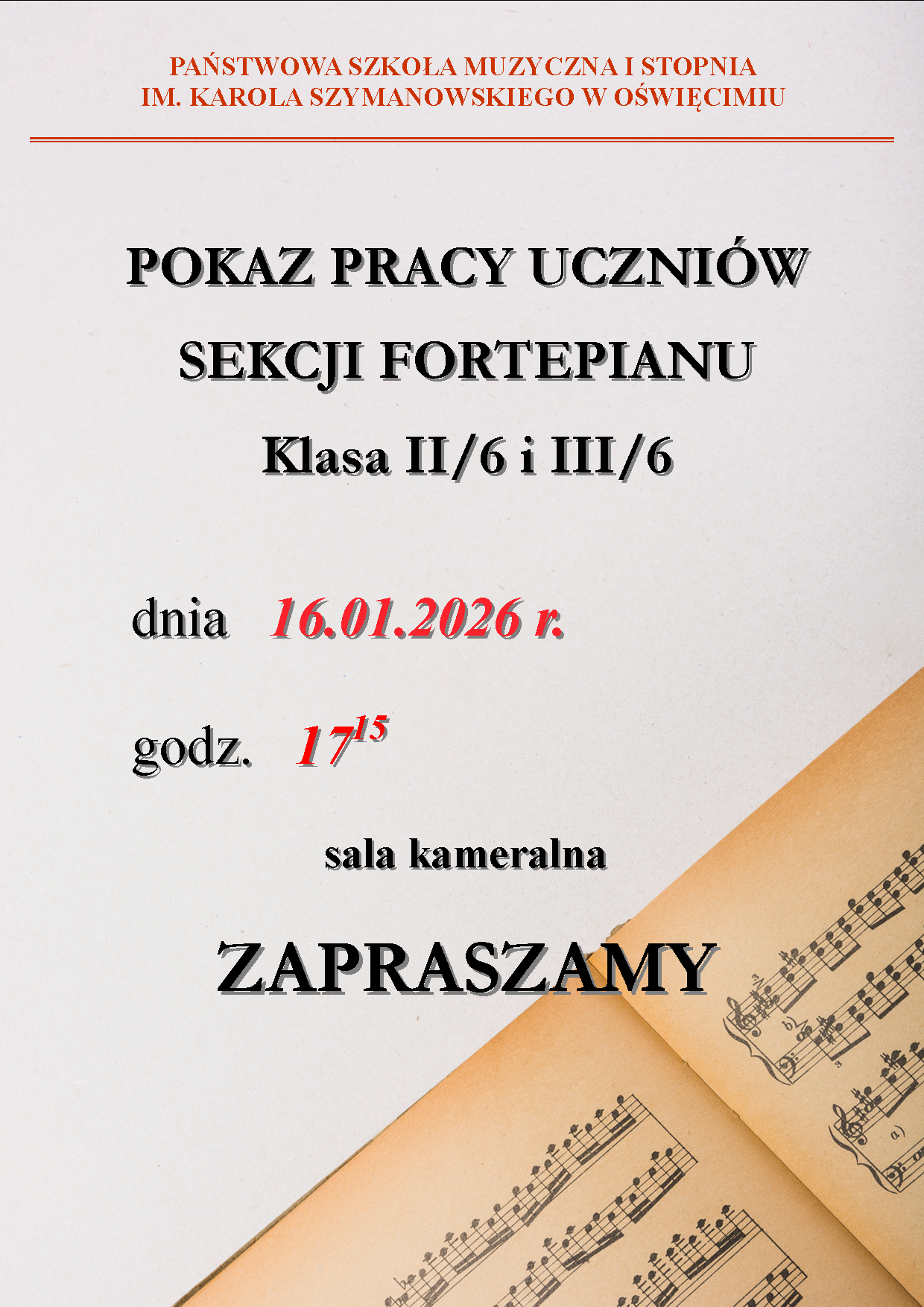Serdecznie zapraszamy uczniów szkoły wraz z bliskimi na pokaz pracy sekcji fortepianu w wykonaniu uczniów klasy drugiej i trzeciej sześcioletniej, który odbędzie się 16 stycznia 2026 r. o godz. 1715 w sali kameralnej.