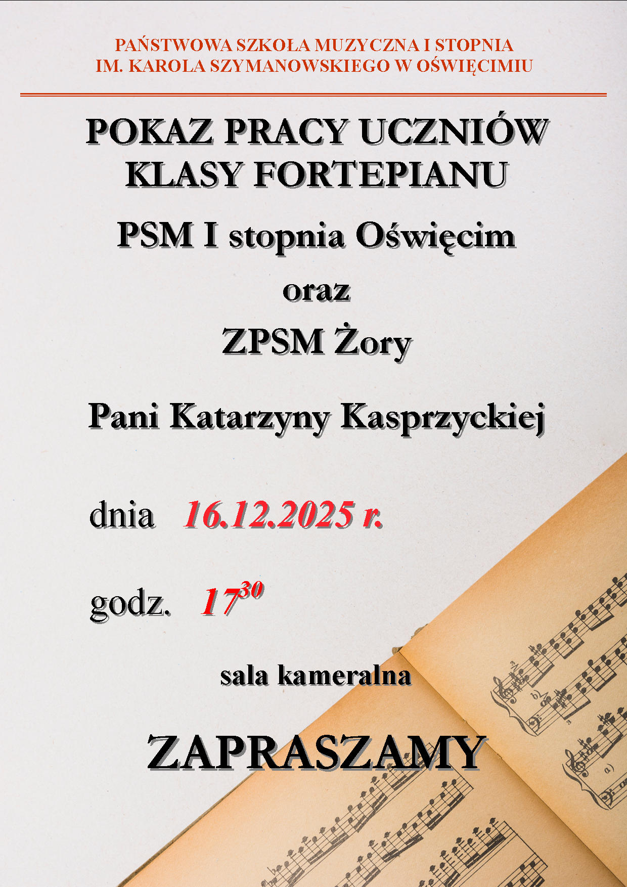 Zapraszamy na pokaz pracy uczniów klasy fortepianu Państwowej Szkoły Muzycznej I stopnia w Oświęcimiu oraz Zespołu Państwowej Szkoły Muzycznej w Żorach pani Katarzyny Kasprzyckiej, który odbędzie się 16 grudnia 2025 r. w sali kameralnej o godz. 17:30