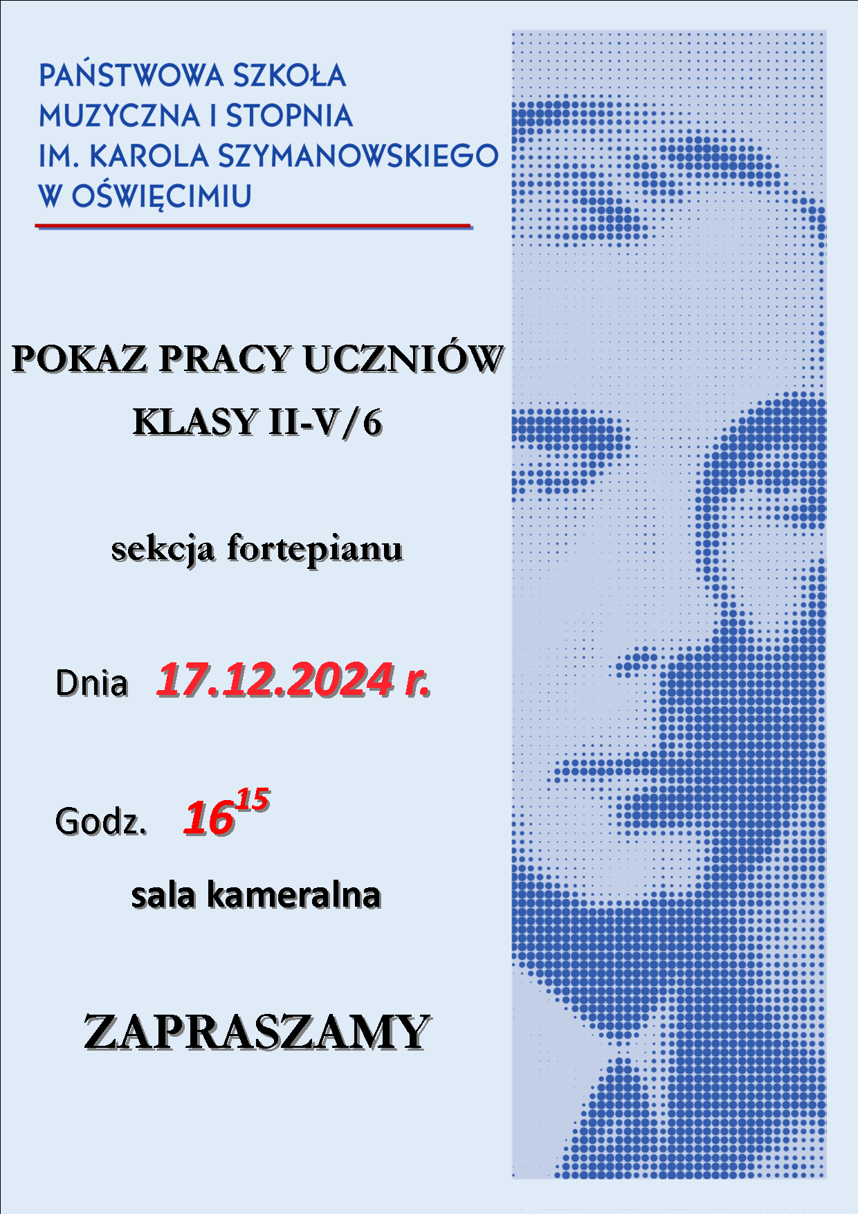 Zapraszamy na pokaz pracy w wykonaniu uczniów klasy pianistów II-V/6, który odbędzie się 17 grudnia 2024 r. w sali kameralnej o godz. 16:15.