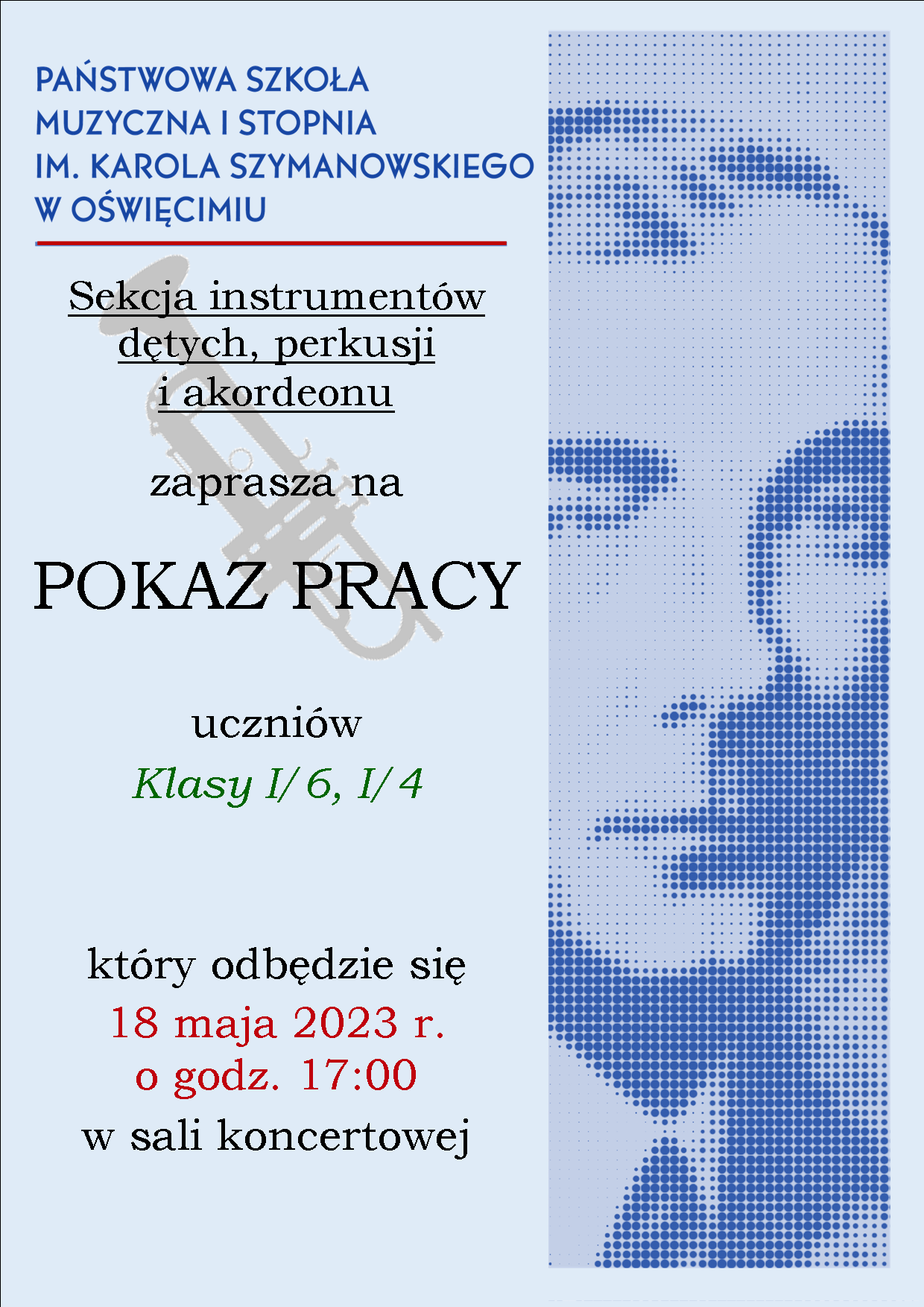 Sekcja instrumentów dętych, perkusji i akordeonu zaprasza na pokaz pracy uczniów klas I/6 i I/4. Odbędzie się on 18 maja 2023 r. o godz. 17:00 w sali koncertowej.