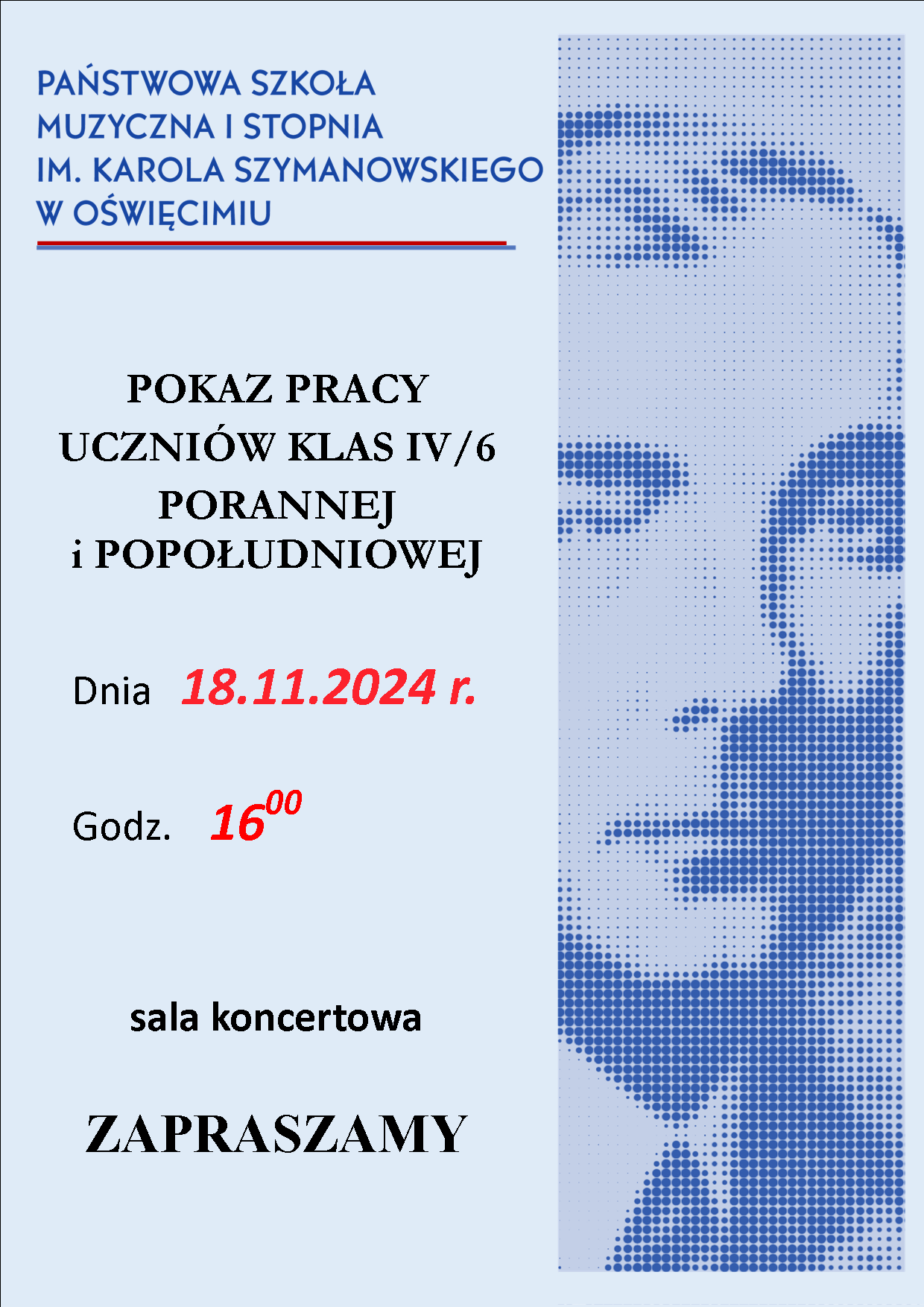 Zapraszamy na pokaz pracy w wykonaniu uczniów klasy czwartej porannej i popołudniowej, który odbędzie się 18 listopada 2024 r. w sali koncertowej o godz. 16:00