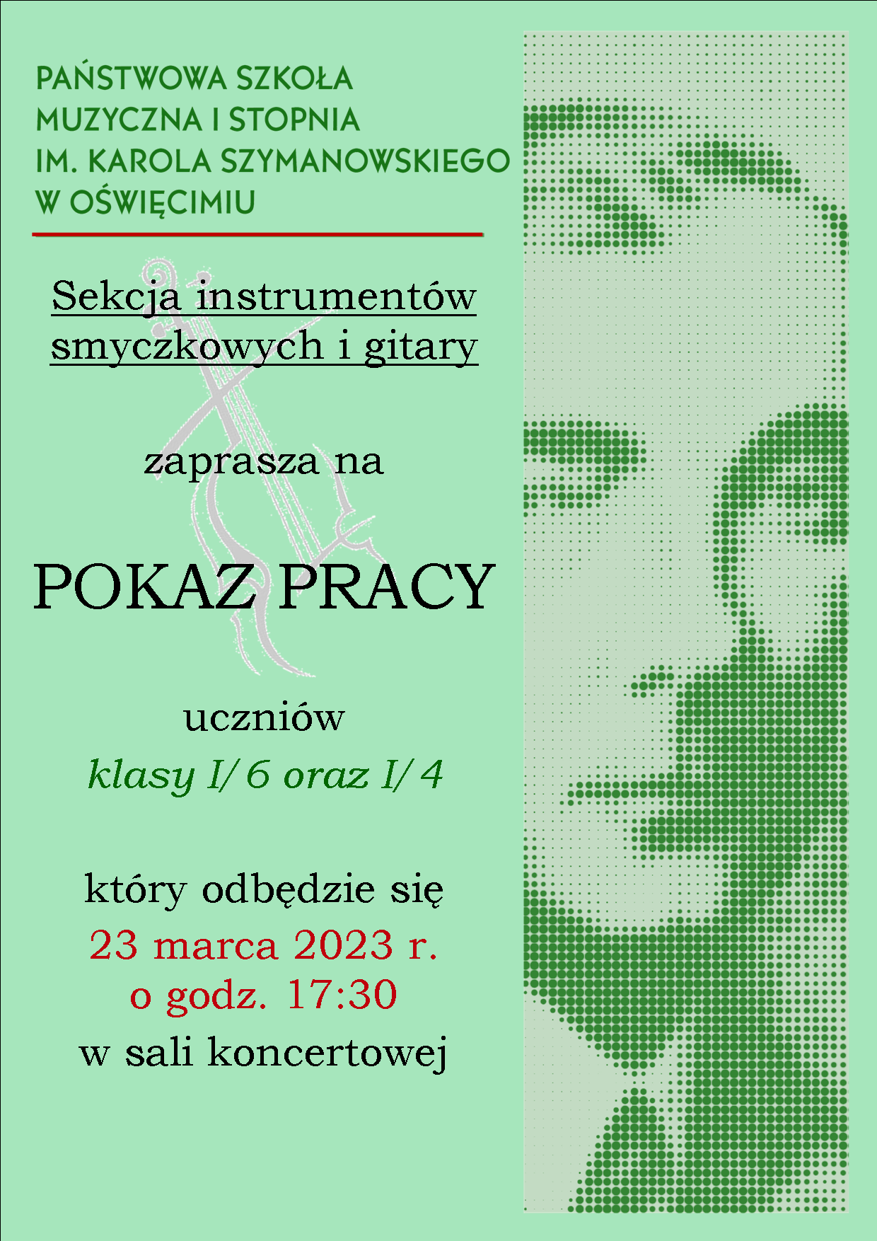Sekcja instrumentów smyczkowych i gitary zaprasza na pokaz pracy uczniów klas pierwszych cyklu sześcioletniego i czteroletniego. Odbędzie się on 23 marca 2023 r. o godzinie 17:30 w sali koncertowej.