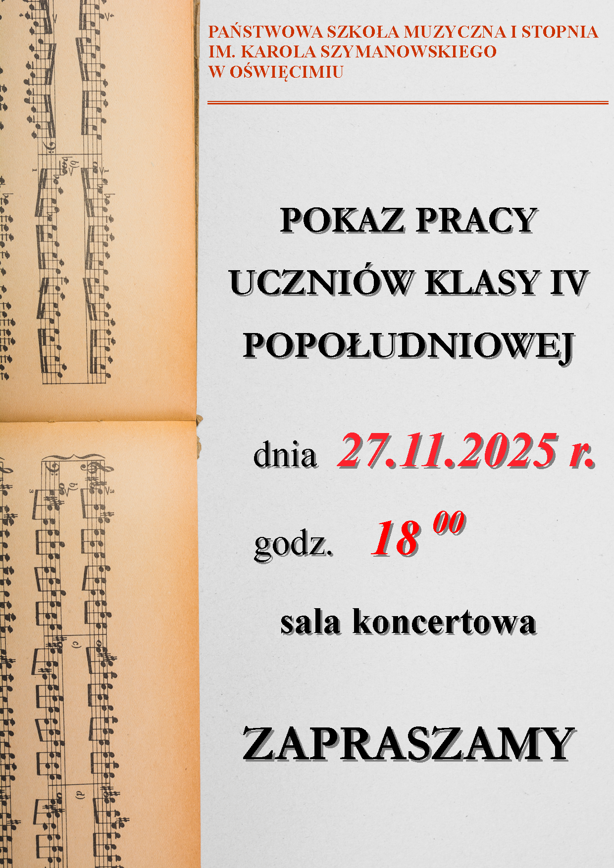 Zapraszamy uczniów szkoły wraz z bliskimi na pokaz pracy w wykonaniu uczniów klasy czwartej popołudniowej, który odbędzie się 27 listopada 2025 r. w sali koncertowej o godz. 18:00.