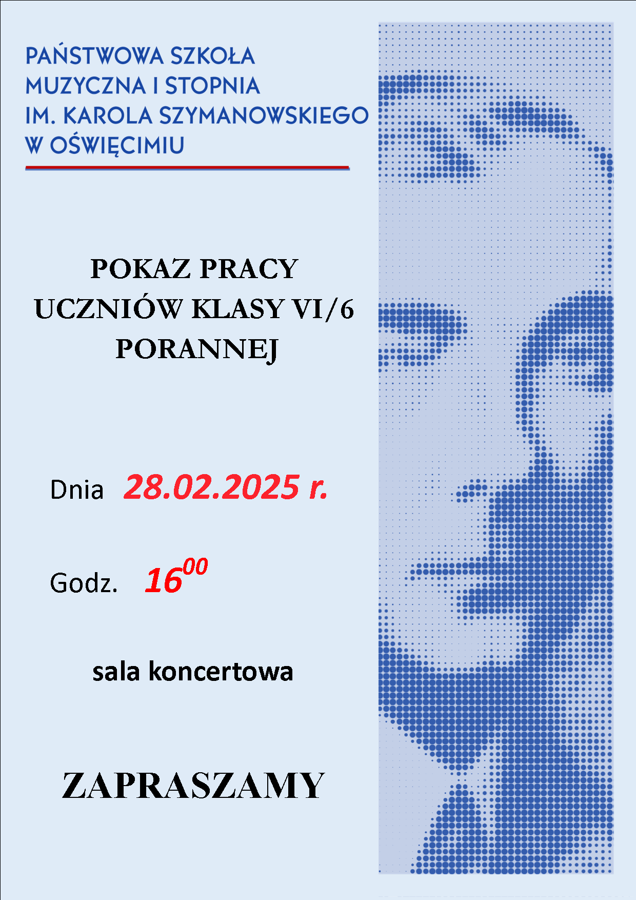 Zapraszamy uczniów szkoły wraz z bliskimi na pokaz pracy w wykonaniu uczniów klasy szóstej porannej, który odbędzie się 28 lutego 2025 r. w sali koncertowej o godz. 16:00