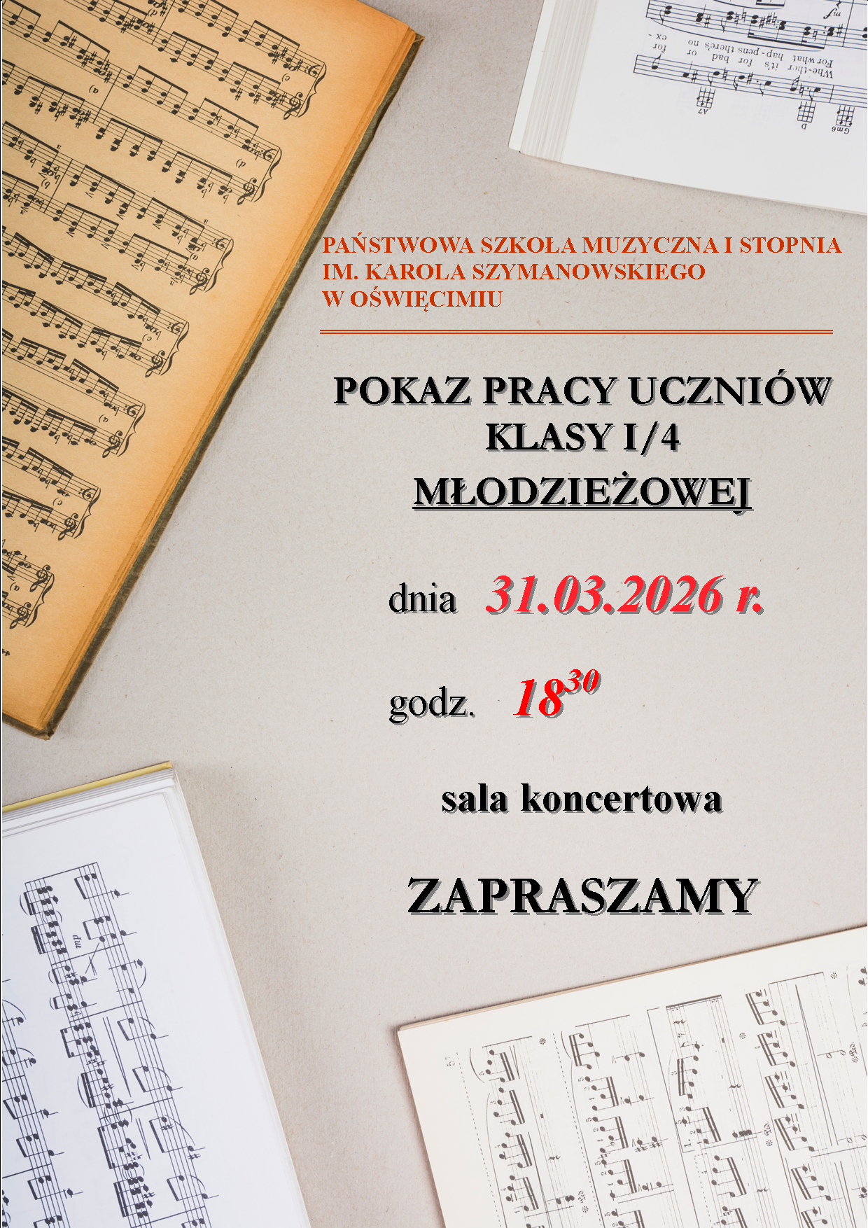 Zapraszamy uczniów szkoły wraz z bliskimi na pokaz pracy w wykonaniu uczniów klasy pierwszej czteroletniej młodzieżowej, który odbędzie się 31 marca 2026 r. w sali koncertowej o godz. 18:30.