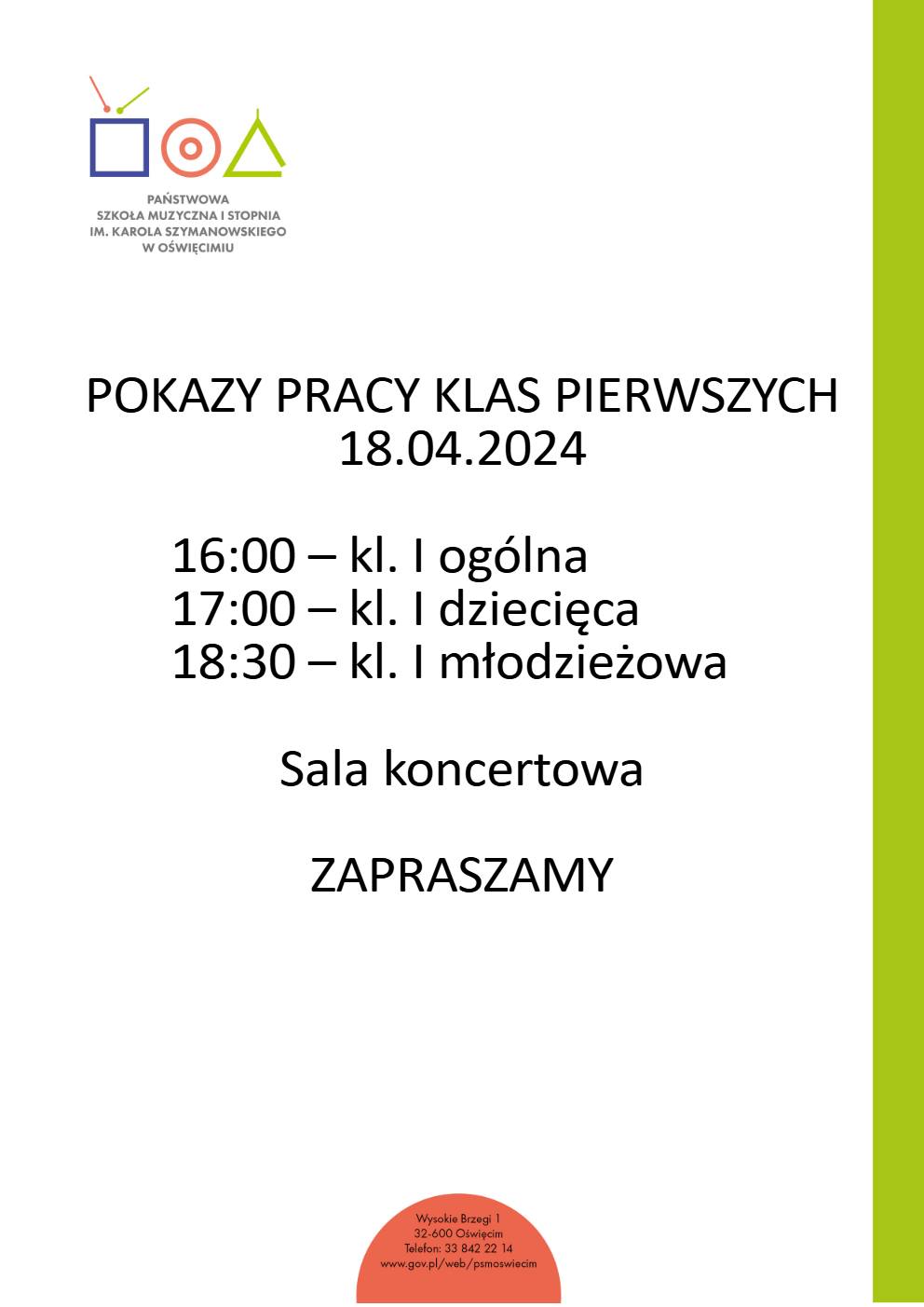 Pokaz pracy klas pierwszych odbedą się 18.04.2024r. w sali koncertowej. O godzinie 16:00 zaprezentują się uczniowie klasy ogólnokształcącej, o 17:00 "dziecięcej", natomiast o 18:30 usłyszymy uczniów cyklu młodzieżowego.