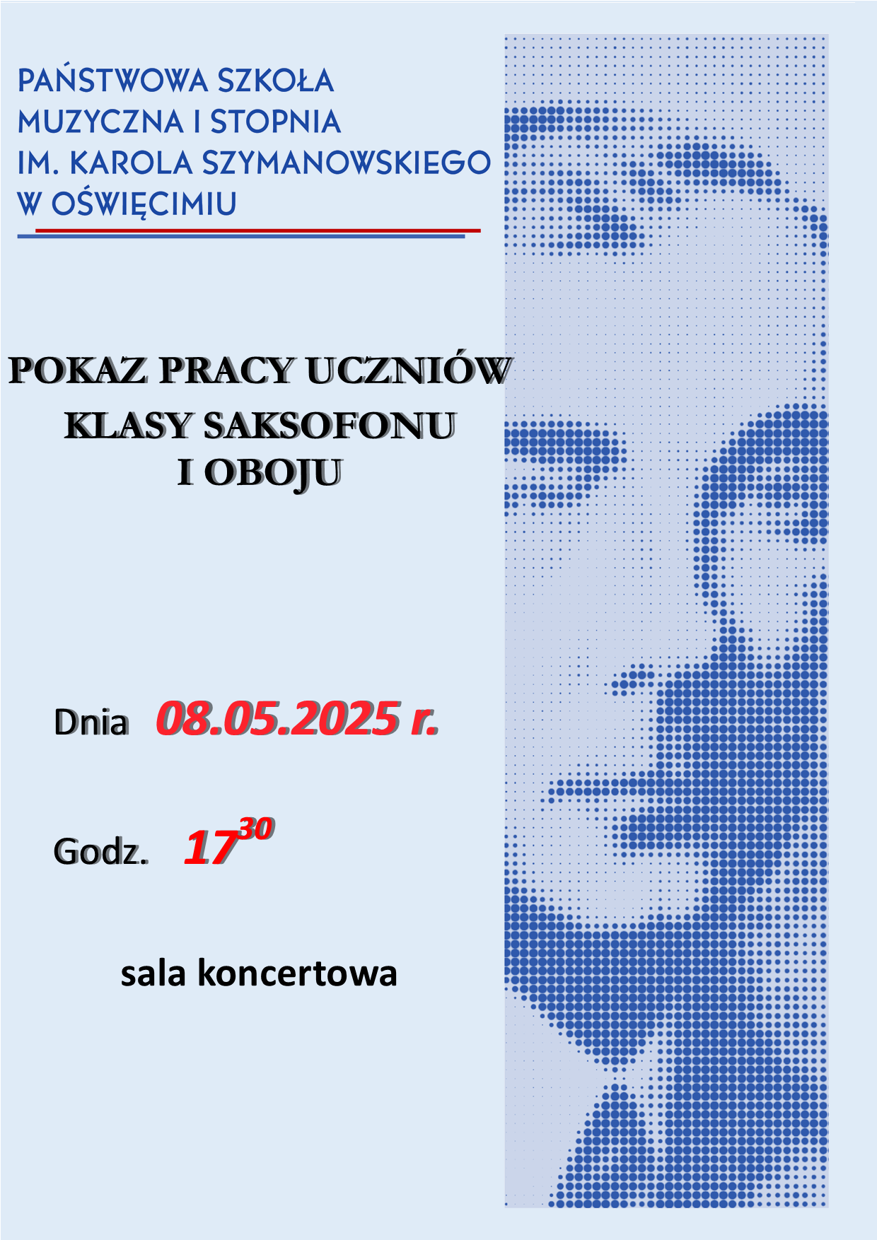 Serdecznie zapraszamy uczniów szkoły wraz z bliskimi na pokaz pracy klas saksofonu i oboju. 8 maja 2025 r. godz. 17:30, sala koncertowa.