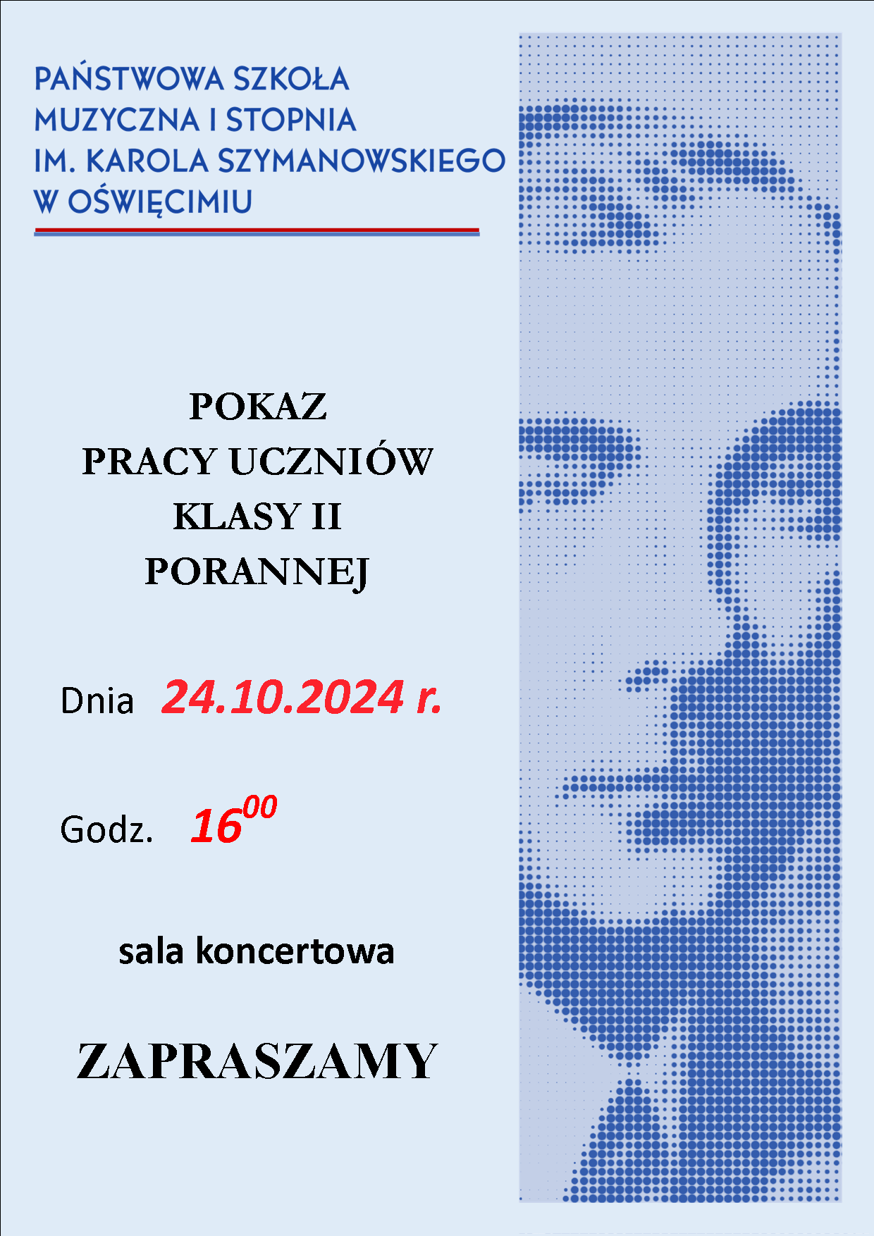 Zapraszamy na pokaz pracy w wykonaniu uczniów klasy drugiej porannej, który odbędzie się 24.10.2024 w sali koncertowej o godz. 16:00