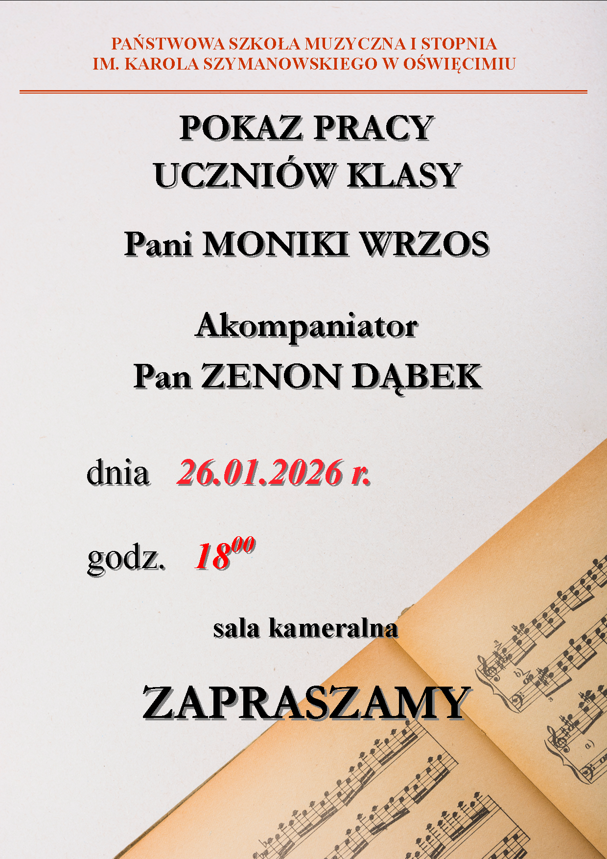 Zapraszamy uczniów szkoły wraz z bliskimi na pokaz pracy uczniów klasy pani Moniki Wrzos, który odbędzie się 26 stycznia 2026 r. w sali kameralnej o godz. 18:00. Akompaniować będzie pan Zenon Dąbek.