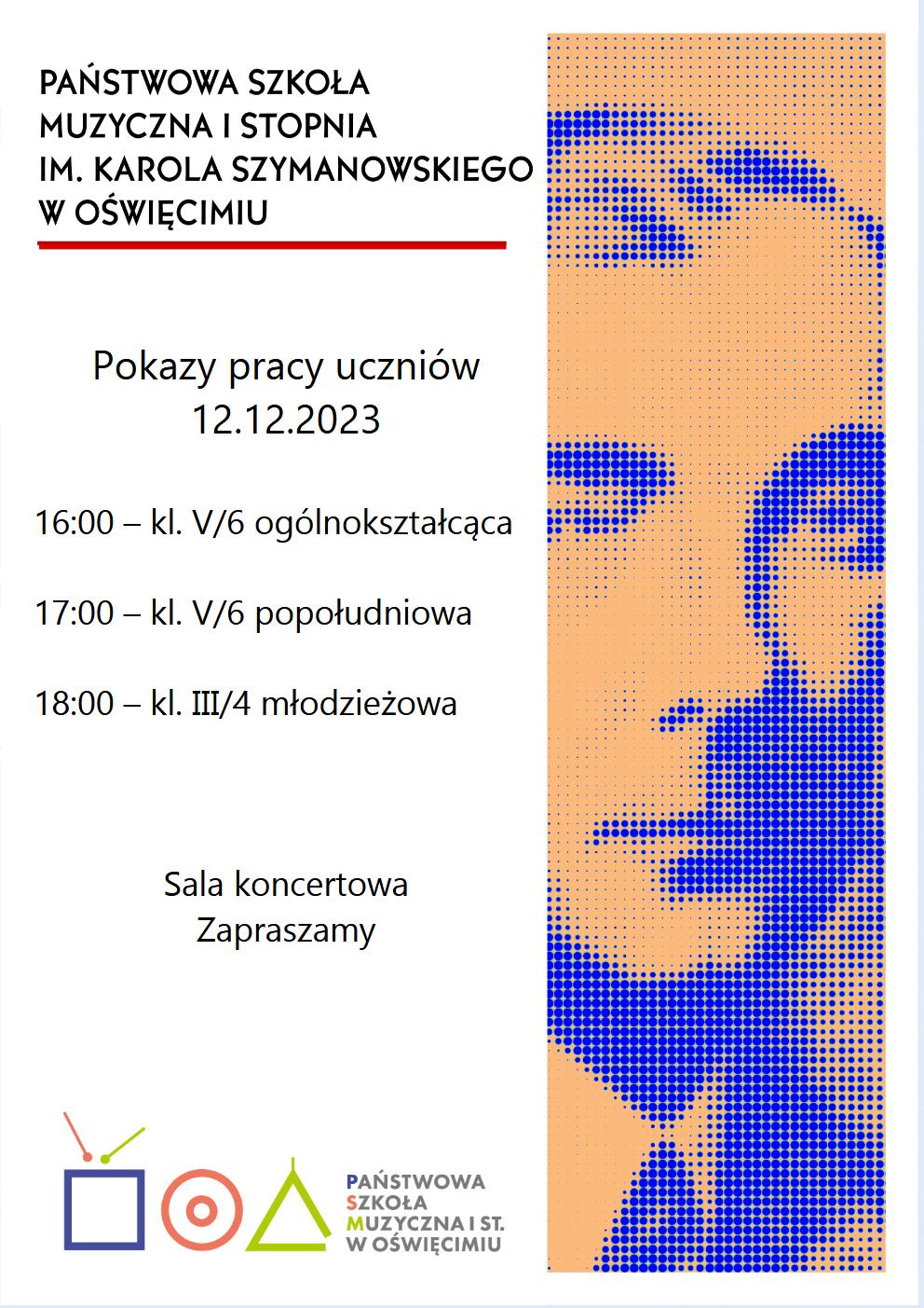 Serdecznie zapraszamy na pokazy pracy 12.12.2023. O godzinie 16:00 zaprezentują się uczniowie klasy V/6 ogólnokształcącej, o 17:00 V/6 popołudniowej, natomiast o 18:00 III/4 młodzieżowej. Wydarzenie będzie miało miejsce na sali koncertowej.