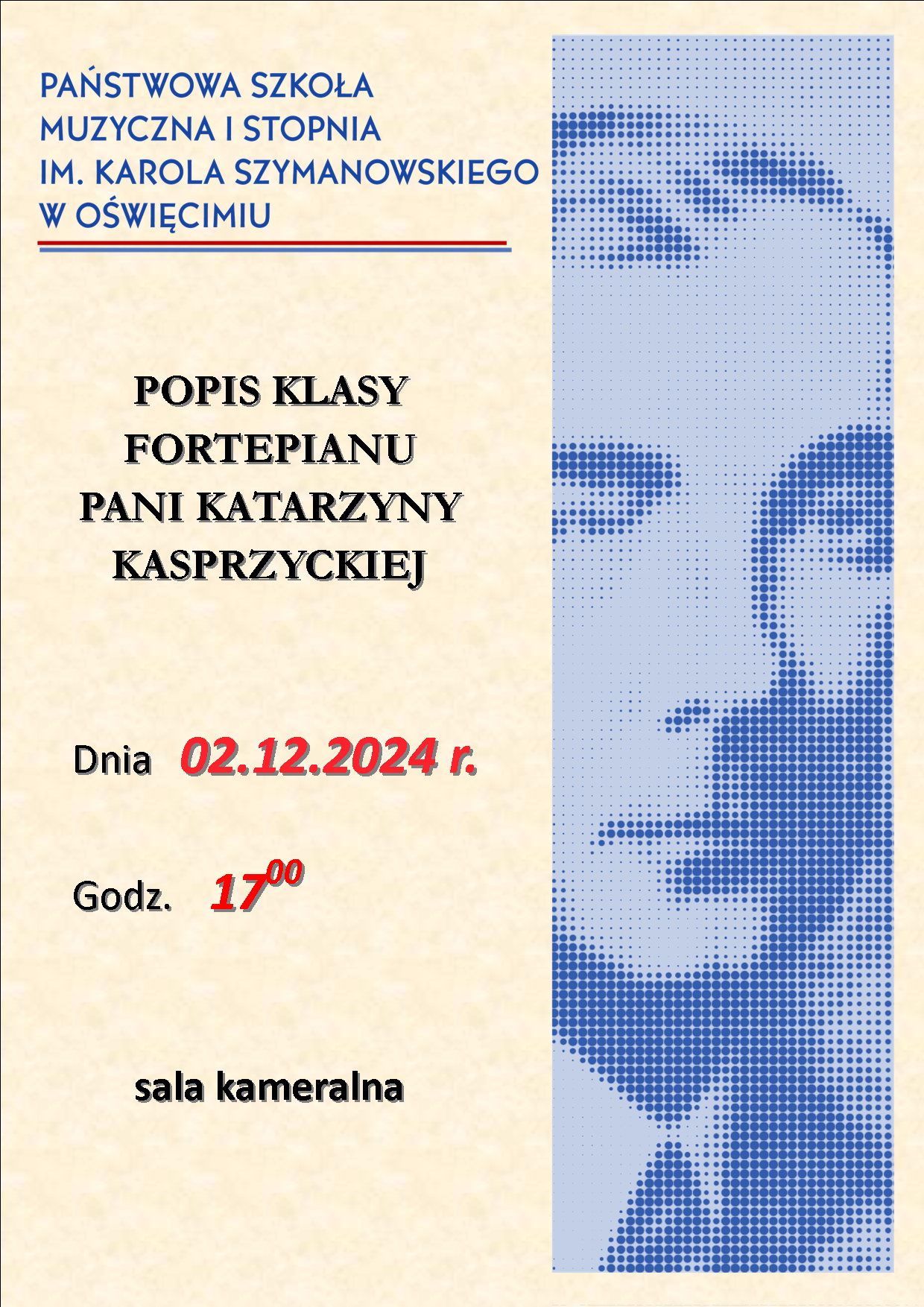 Zapraszamy na popis klasy fortepianu Pani Katarzyny Kasprzyckiej, który odbędzie się 2 grudnia 2024 r. w sali kameralnejj o godz. 17:00