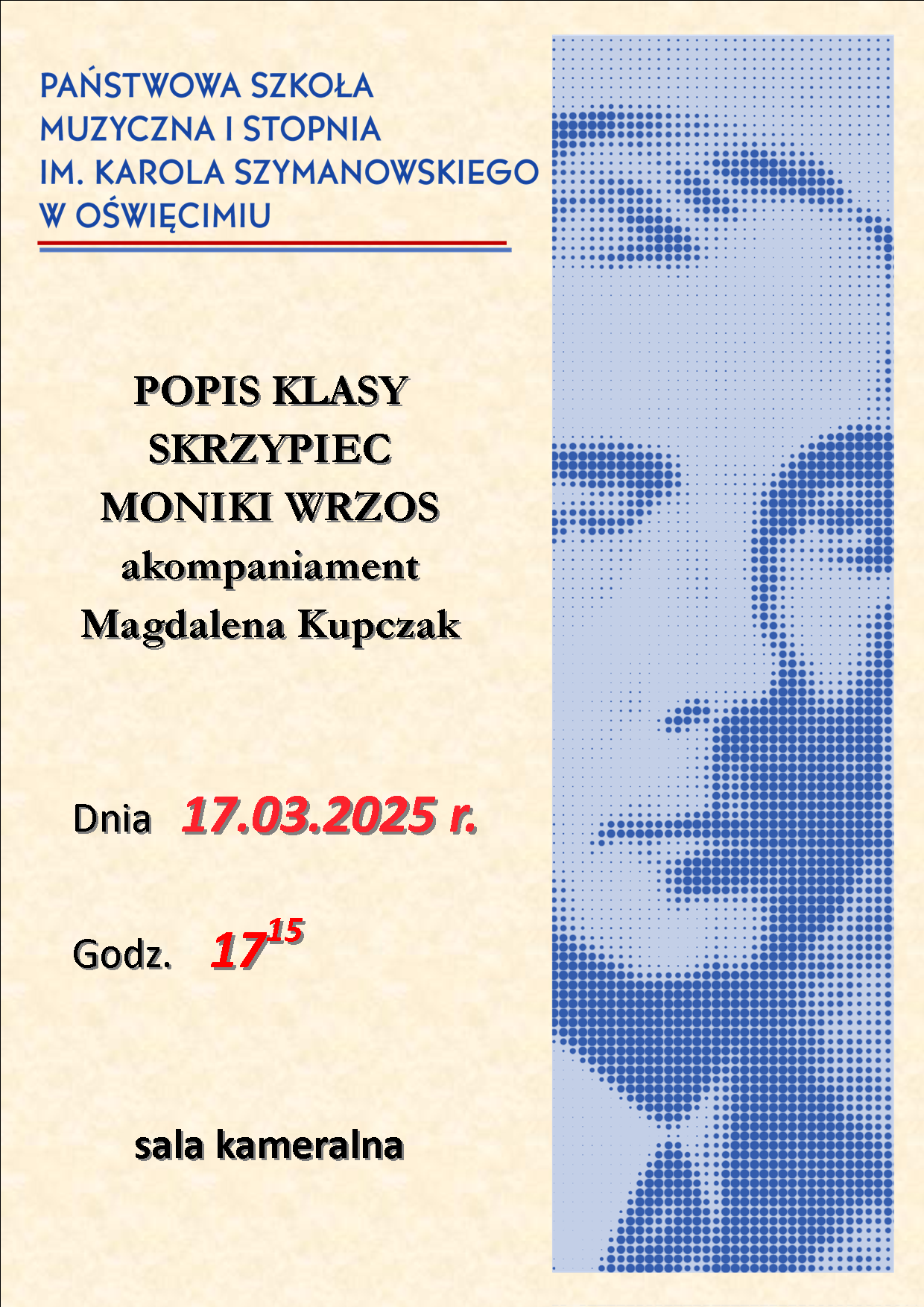 Zapraszamy uczniów szkoły wraz z bliskimi na popis klasy skrzypiec pani Moniki Wrzos, który odbędzie się 17 marca 2025 r. w sali kameralnej o godz. 17:15. Akompaniować będzie pani Magdalena Kupczak.