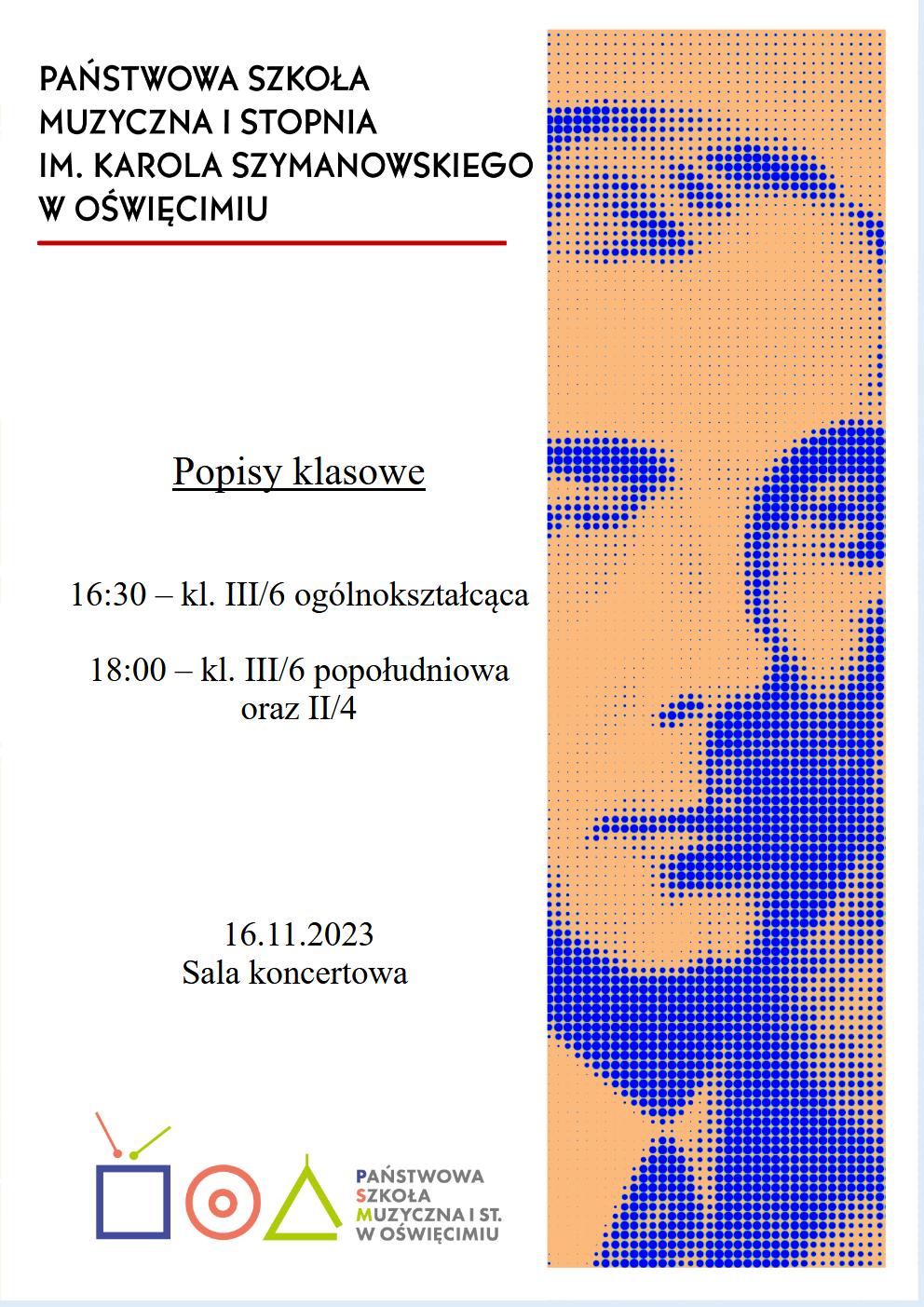 16 listopada 2023 zapraszamy na popisy klasowe. O 16:30 wystąpią uczniowie klasy trzeciej ogólnokształcącej, natomiast o 18:00 uczniowie klasy trzeciej cyklu sześcioletniego (popołudniowa) oraz drugiej cyklu czteroletniego. Sala koncertowa.