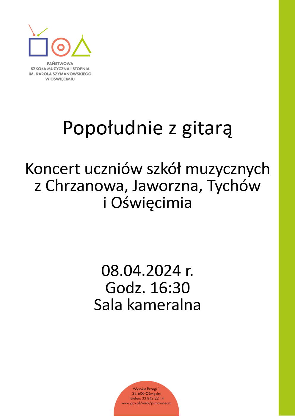 Sekcja Instrumentów Smyczkowych i Gitary zaprasza na koncert pt. "Popołudnie z gitarą". Wystąpią uczniowie klas gitary ze szkół muzycznych w Chrzanowie, Jaworznie, Tychach i Oświęcimiu. 8.08.2024, godz. 16:30, sala kameralna.