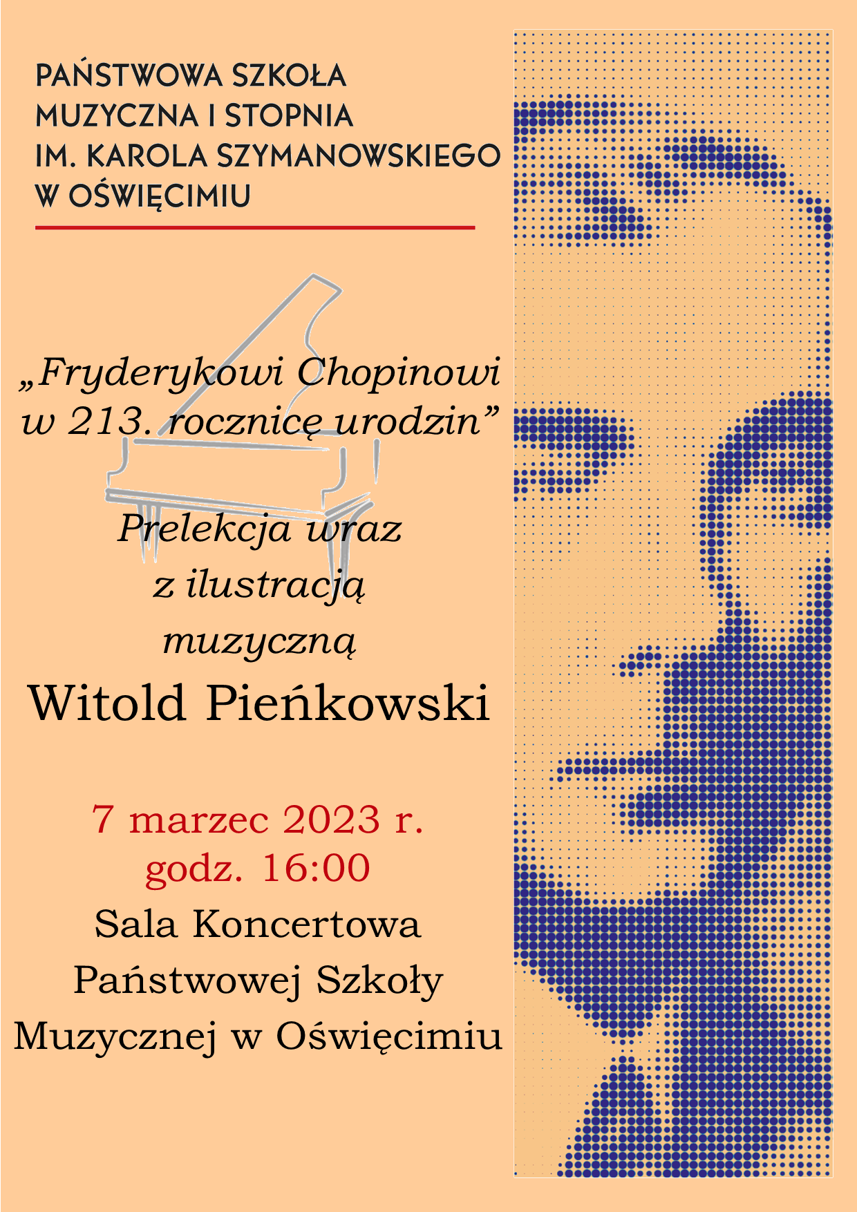 7 marca o godzinie 16:00 na sali koncertowej odbędzie się prelekcja z ilustracją muzyczną pt. "Fryderykowi Chopinowi w 213. rocznicę urodzin", którą poprowadzi Pan Witold Pieńkowski. Serdecznie zapraszamy.