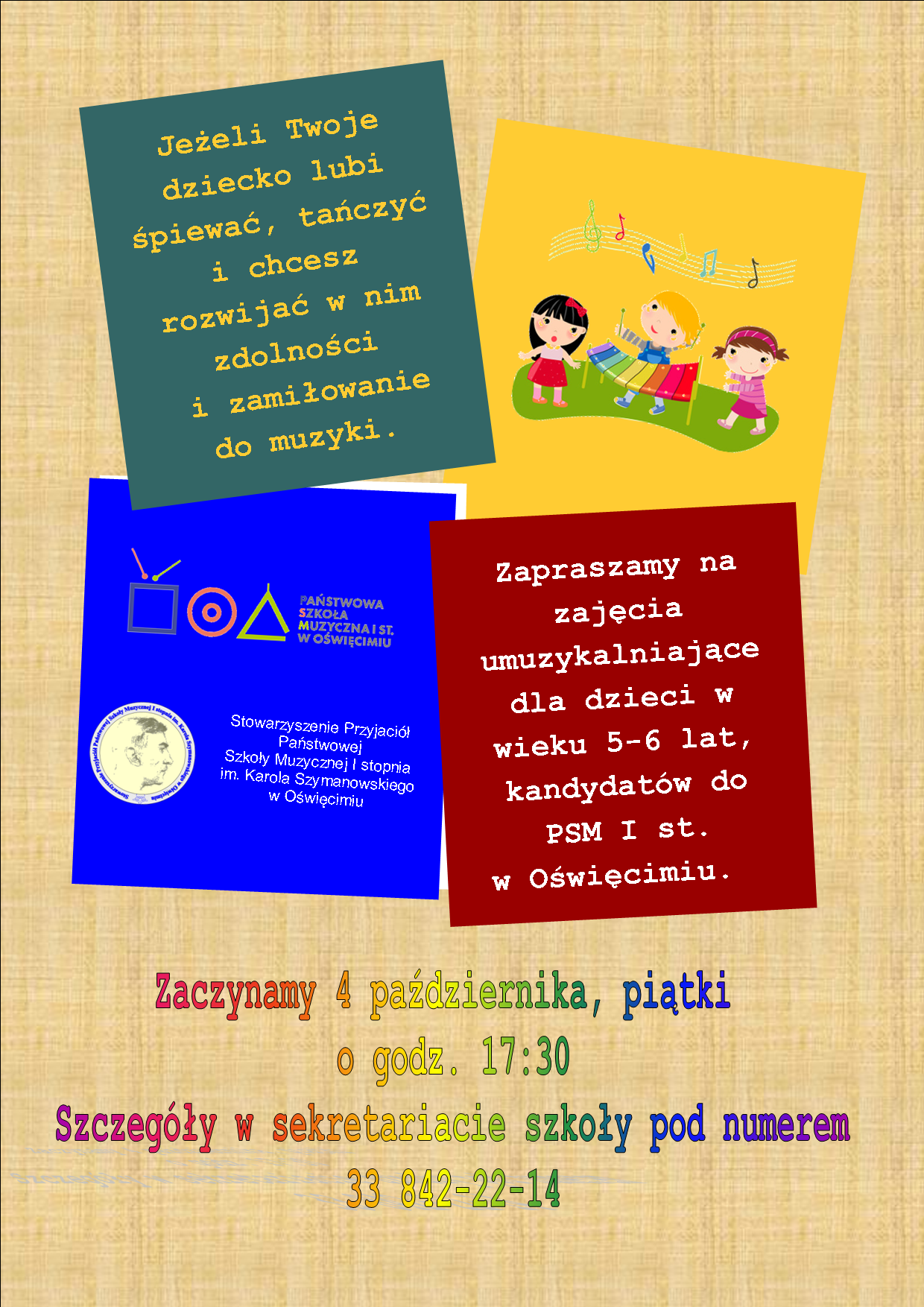 Zapraszamy na zajęcia umuzykalniające dla dzieci w wieku 5-6 lat , kandydatów do PSM I st. w Oświęcimiu. Zaczynamy 4 października, piątki godz. 17:30. Szczegóły w sekretariacie szkoły pod numerem 33 842-22-14