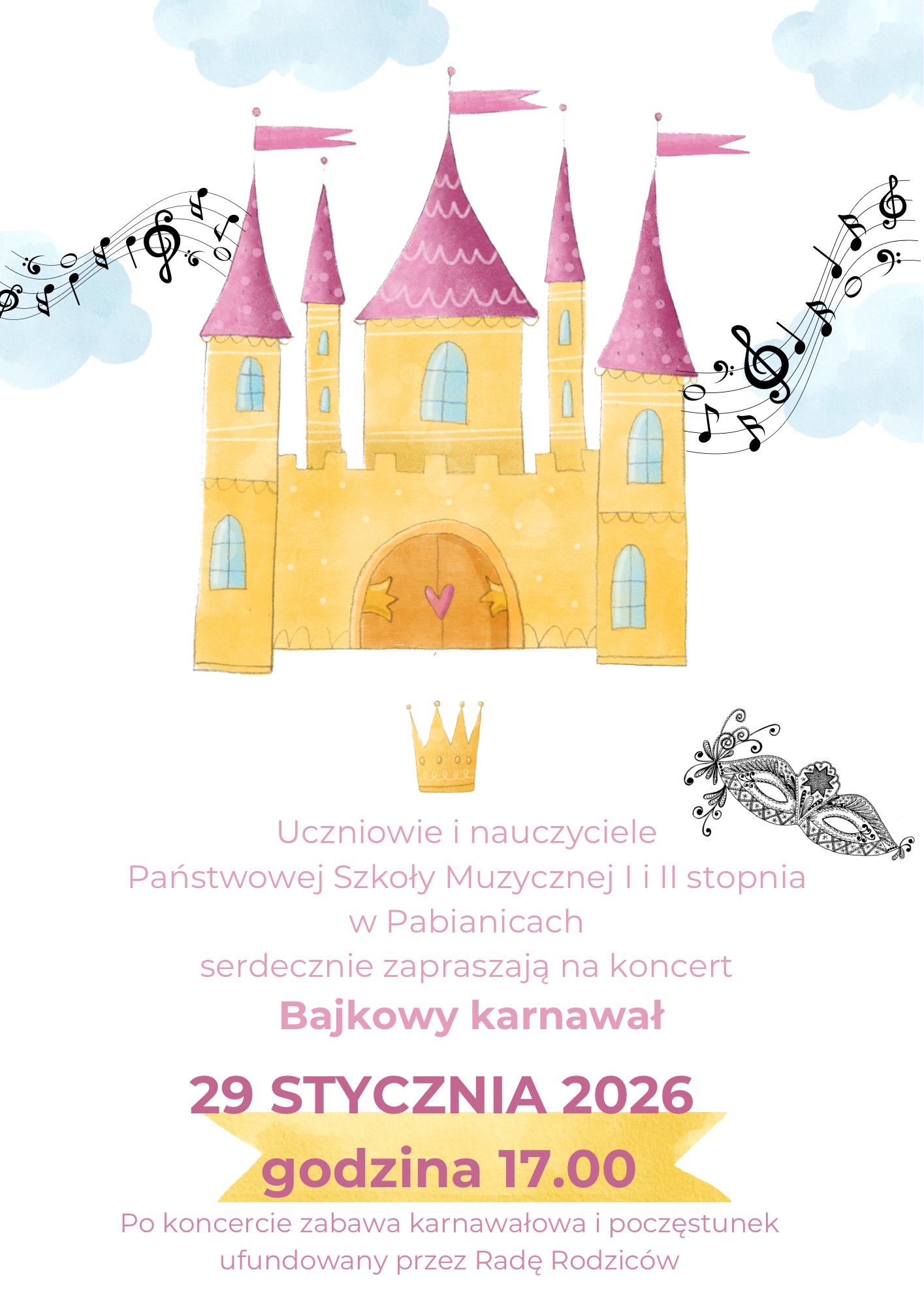 Uczniowie i Nauczyciele Pańśtwowej Szkoły Muzycznej zapraszają na koncert w dniu 29 stycznia 2026r. o godzinie 17.00. Po koncercie odbędzie się zabawa karnawałowa i poczestunek ufundowany przez Radę Rodziców.