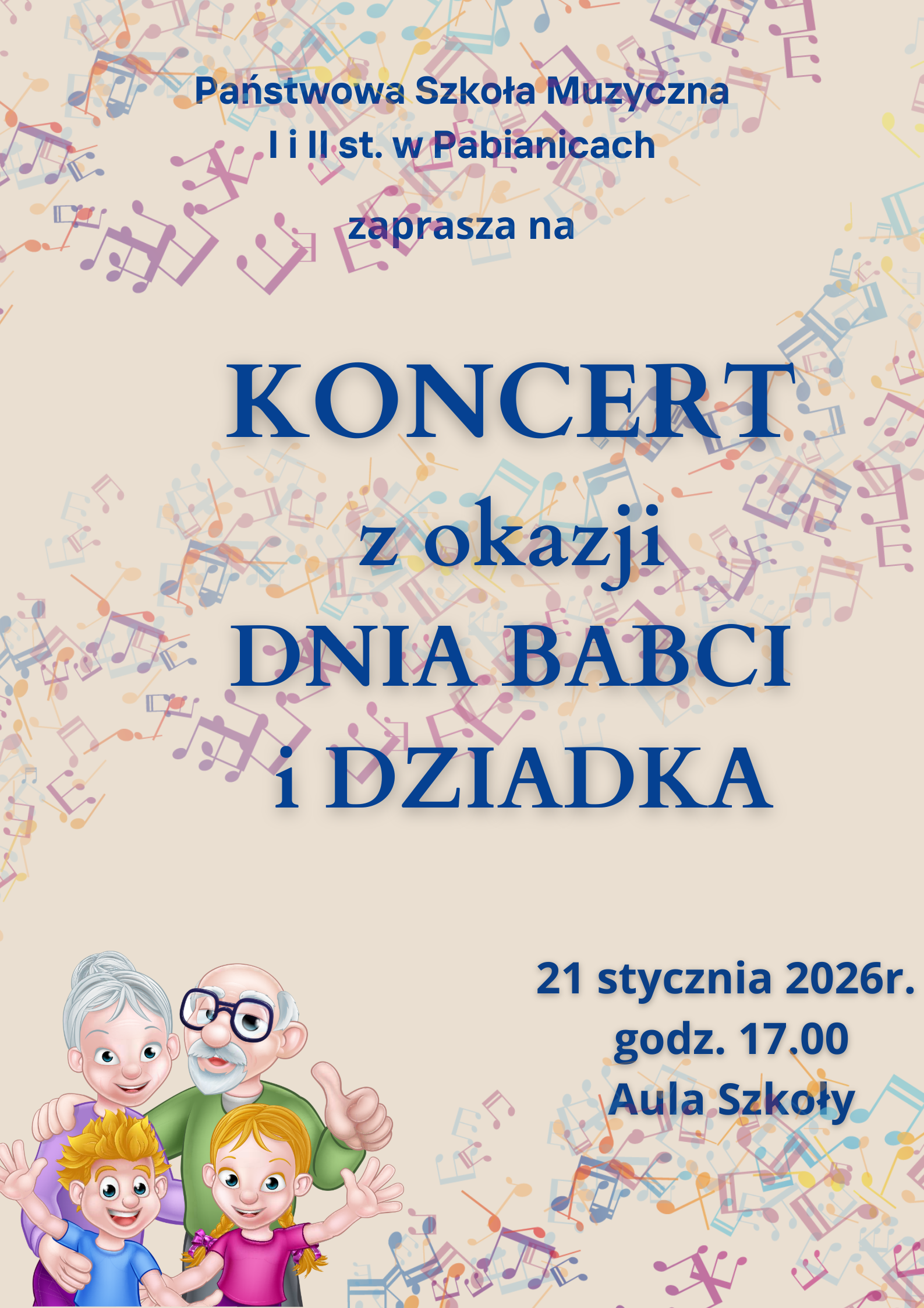 Uczniowie Państwowej Szkoły Muzycznej I i II stopnia serdecznie zapraszają Babcie i Dziadków na uroczysty koncert .