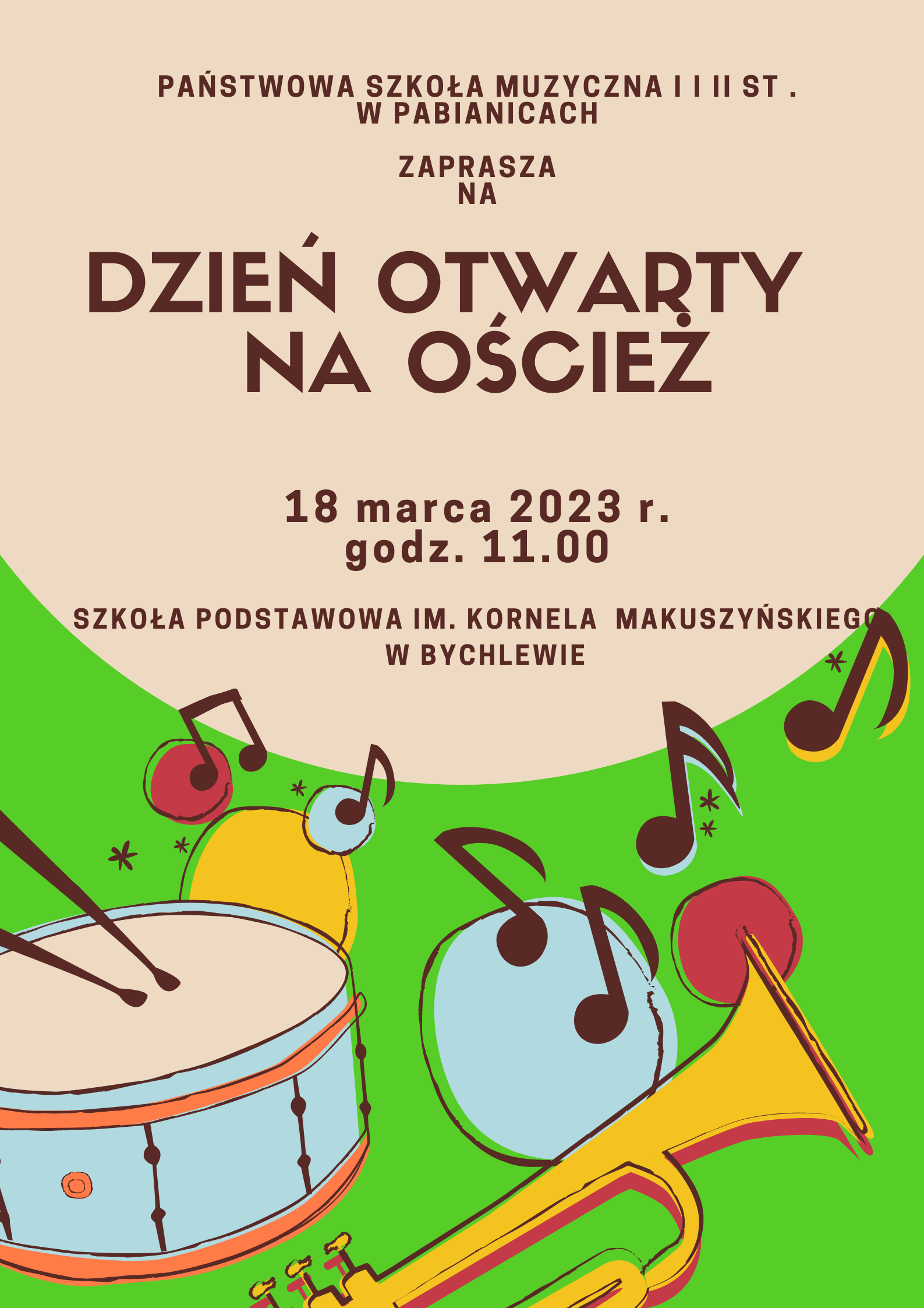 Serdecznie zapraszamy do udziału w Dniu Otwartym Państwowej Szkoły Muzycznej I i II st. w Pabianicach w dniu 18 marca 2023 r. od godz. 11.00 w gościnnych murach Szkoły Podstawowej w Bychlewie. Podczas Dni Otwartych odbędzie się wystawa prac nadesłanych w konkursie "Jaki to instrument" z wręczenie nagród i wyróznień.
