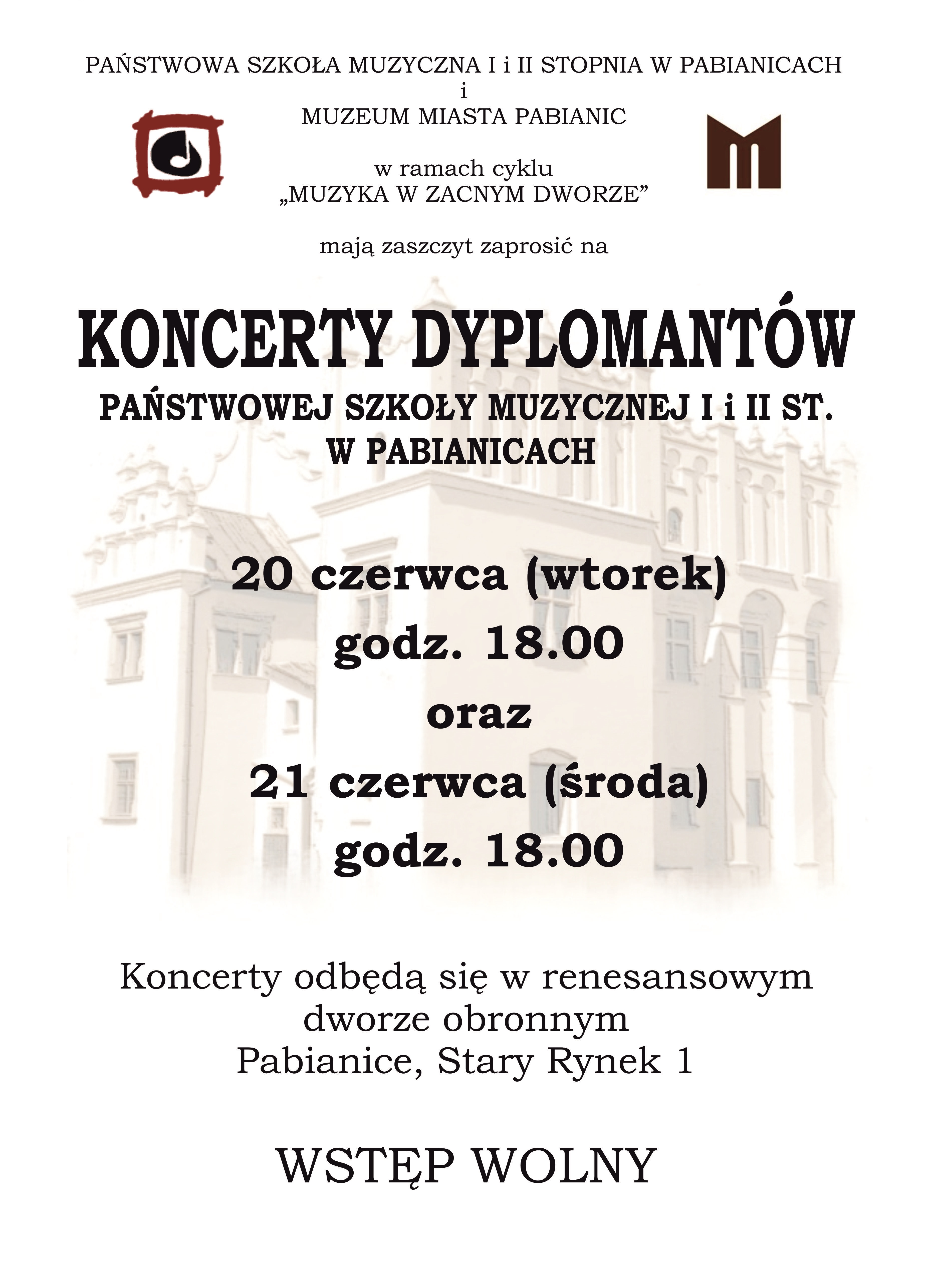 Dyplomanci PSM I i II st w Pabianicach wraz z nauczycielami serdecznie zapraszają na koncerty.