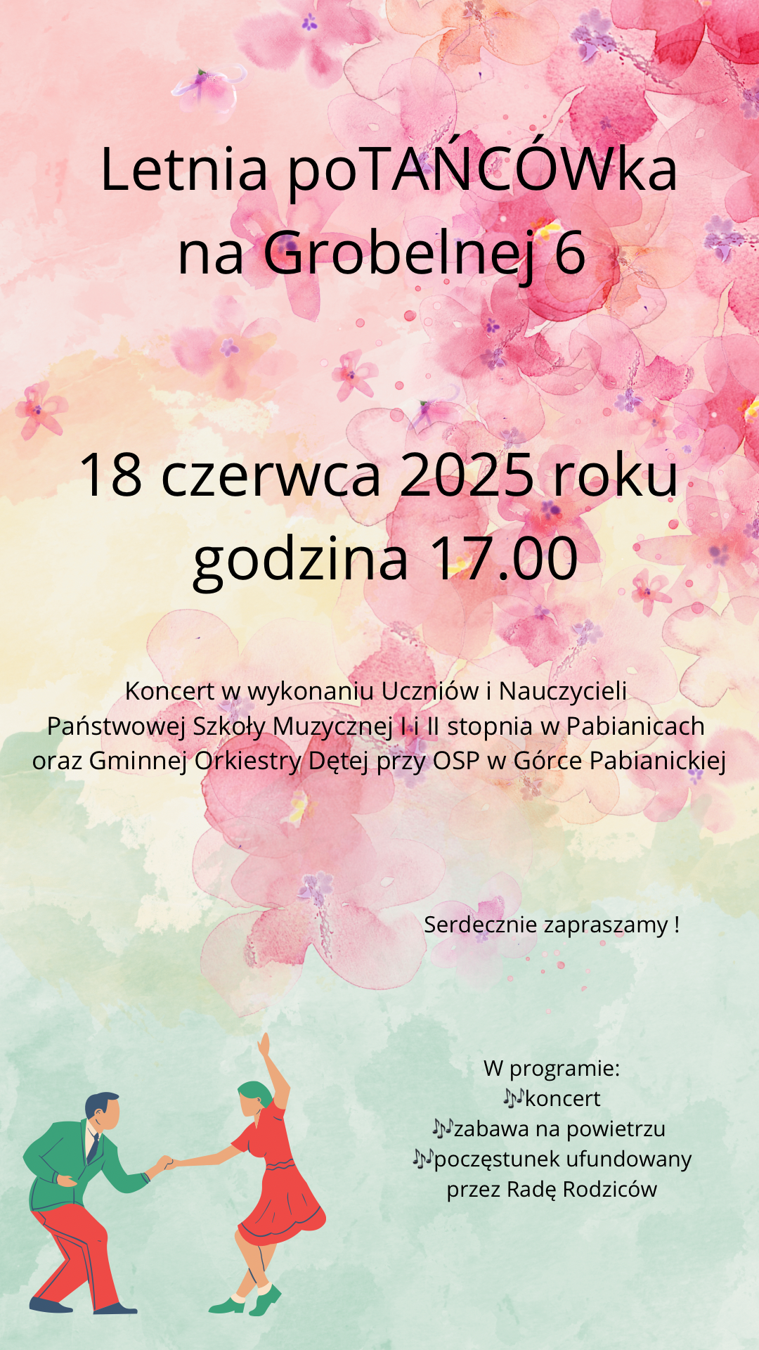 Uczniowie i Nauczyciele Państwowej Szkoły Muzycznej I i II st. w Pabianicach serdecznie zapraszają wszystkich miłośników muzyki i tańca na imprezę plenerową "Letnia poTAŃCÓWka na Grobelnej 6"