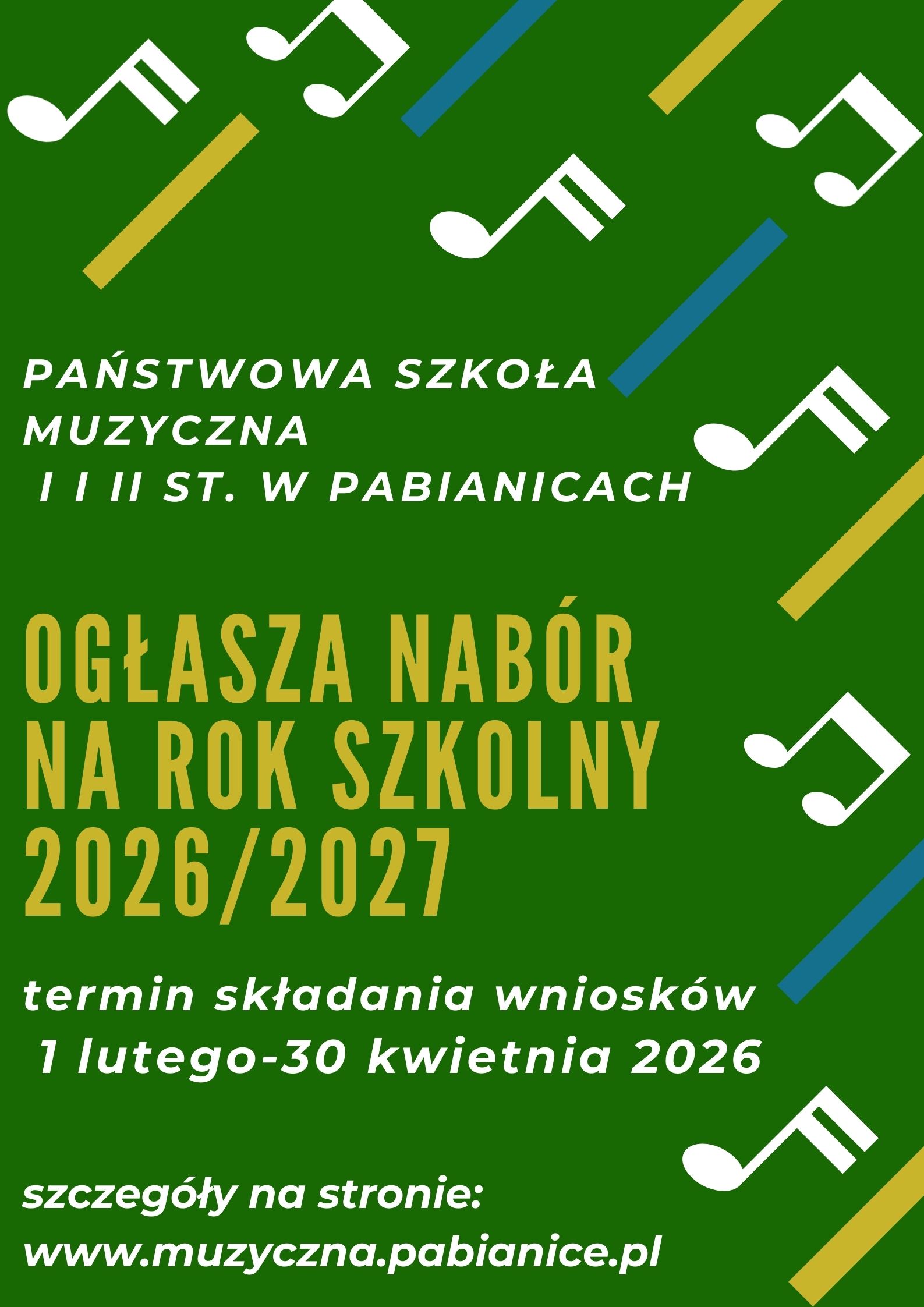 Państwowa Szkoła Muzyczna I i II stopnia w Pabianicach ogłasza zapisy na rok szkolny 2026 / 2027: