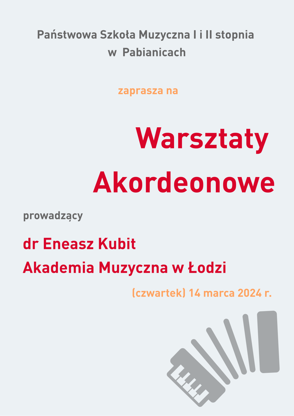 Sekcja Instrumentów Dętych, Akordeonu i Perkusji zaprasza na Warszaty akordeonowe, które poprowadzi dr Eneasz Kubit z Akademii Muzycznej im. G. i K. Bacewiczów w Łodzi.