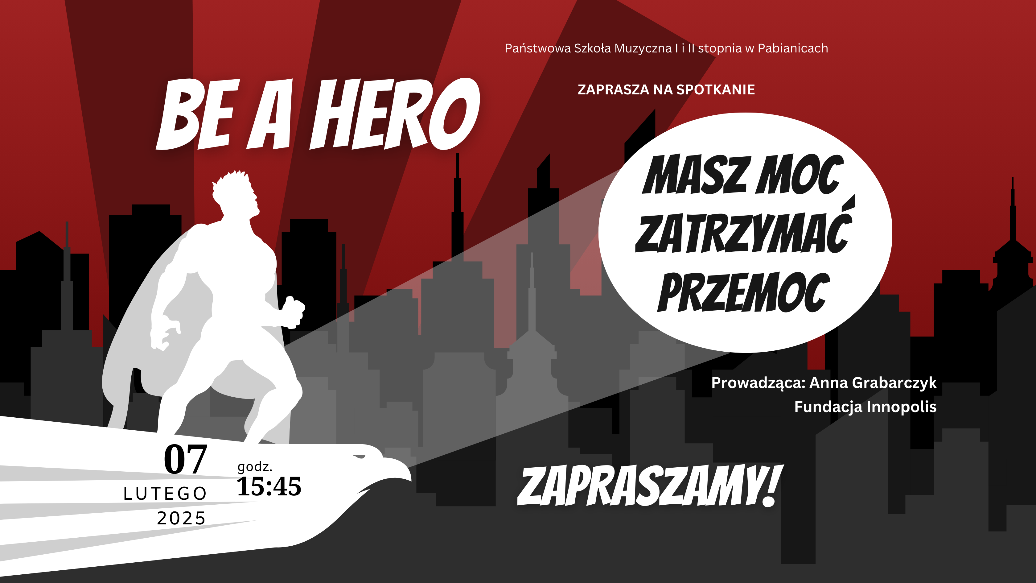Państwowa Szkoła Muzyczna I i II st w Pabianicach zaprasza uczniów klas IV-VI cyklu 6-letniego i klas I-IV cyklu 4-letniego PSM I st. na warsztaty "Be a hero - masz moc zatrzymać przemoc", które poprowadzi Anna Grabarczyk z Fundacji Innopolis.