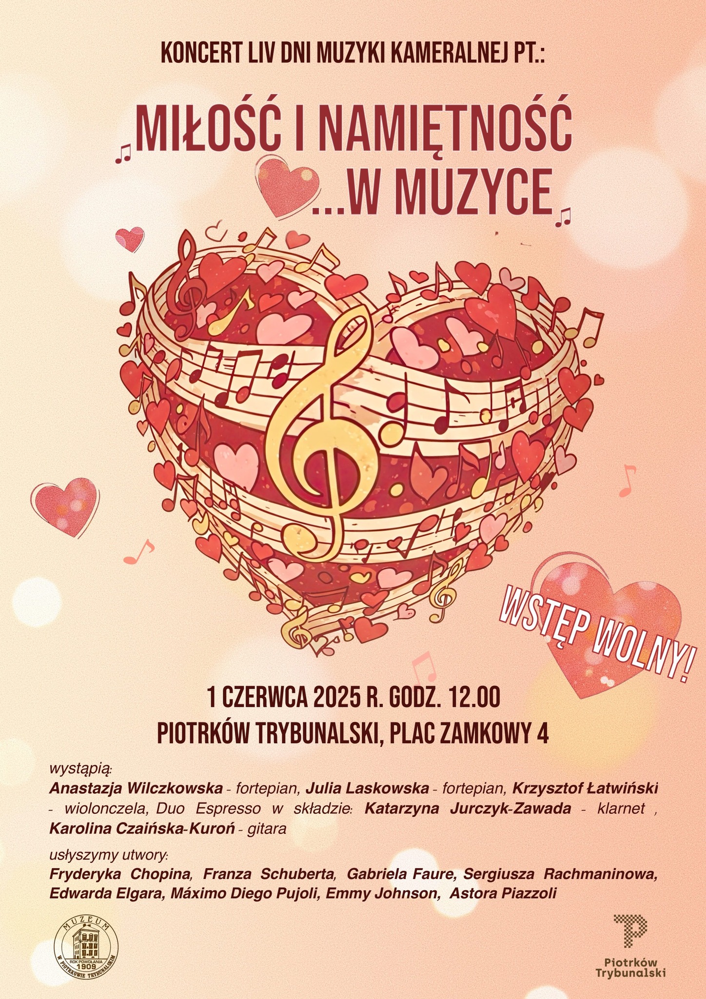Zapraszamy na koncert naszych pedagogów w ramach LIV Dni Muzyki Kameralnej pod tytułem „Miłość i namietność w muzyce”. Koncert odbędzie się 1 czerwca 2025 roku (niedziela) o godzinie 12:00. Miejscem wydarzenia będzie Muzeum w Piotrkowie Trybunalskim, Plac Zamkowy 4. Wstęp jest wolny.