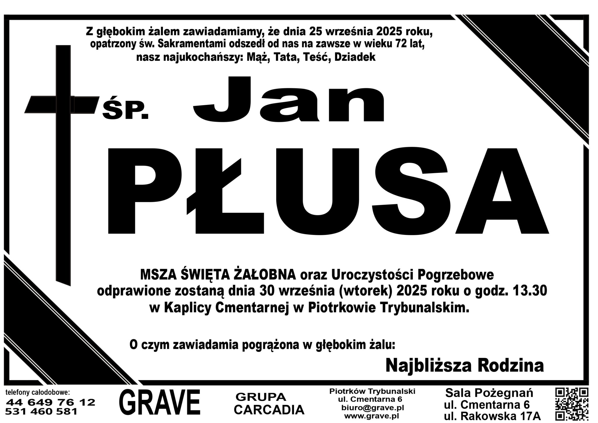 Z głębokim żalem informujemy, że w dniu 25 września 2025 roku zmarł śp. Jan Płusa, wieloletni nauczyciel kontrabasu w Państwowej Szkole Muzycznej I i II stopnia im. Ignacego Jana Paderewskiego w Piotrkowie Trybunalskim.