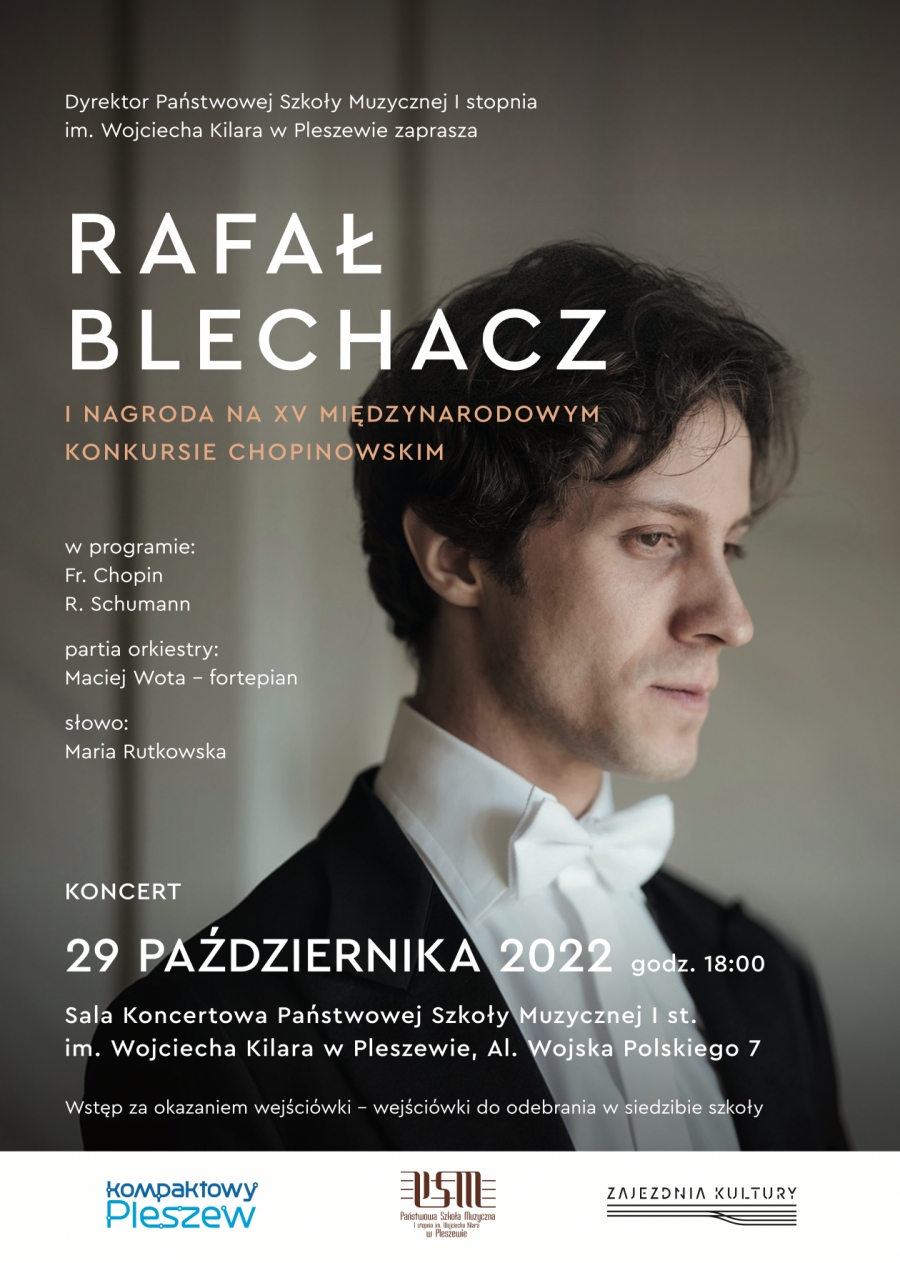 „Sztuka dawania podarunku polega na tym, aby ofiarować coś, czego nie można kupić w żadnym sklepie". Słowa Alana Milne, autora książek o Kubusiu Puchatku, w genialny sposób opisują to, czym dla społeczności naszej Szkoły był nadzwyczajny recital Maestro Rafała Blechacza - zwycięzcy XV Międzynarodowego Konkursu Pianistycznego im. Fryderyka Chopina w Warszawie. Koncert odbył się w Sali Koncertowej naszej Szkoły w sobotę, 29 października 2022 roku. Jak podkreśliła prowadząca koncert Maria Rutkowska, przedsięwzięcie nigdy nie doszłoby do skutku, gdyby nie wieloletnie zabiegi Dyrektora Szkoły, Sławomira Mocha, zmierzające do powstania nowoczesnej Sali Koncertowej z dwoma najwyższej jakości fortepianami marki Steinway i Yamaha. Wybór naszej Szkoły na swój recital Artysta motywował także właśnie wyjątkowością pleszewskiej Szkoły na tle wielu innych placówek tego typu w Polsce.