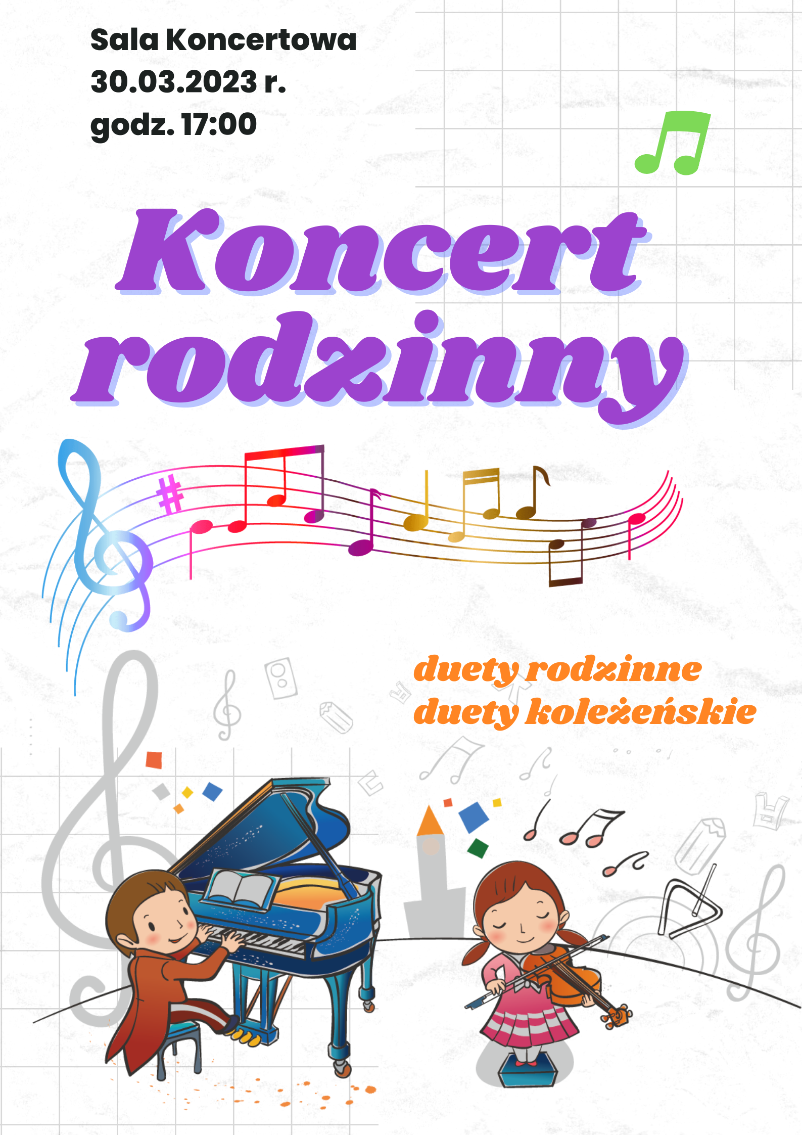 Plakat posiada białe tło. W prawym górnym rogu oraz w lewym dolnym rogu znajdują się kratki. W lewym górnym rogu czarny napis "Sala Koncertowa i data 30.03.2023 r. godz. 17:00". Na środku duży fioletowy napis "Koncert rodzinny". Pod tym kolorowa pięciolinia z kolorowym kluczem wiolinowym oraz nutkami". Pod tym z lewej strony pomarańczowy napis "Duety rodzinne, duety koleżeńskie". Nadole chłopczyk grający na fortepianie a obok niego dziewczynka grająca na skrzypcach. Wokół nich nutki, klucze wiolinowe.