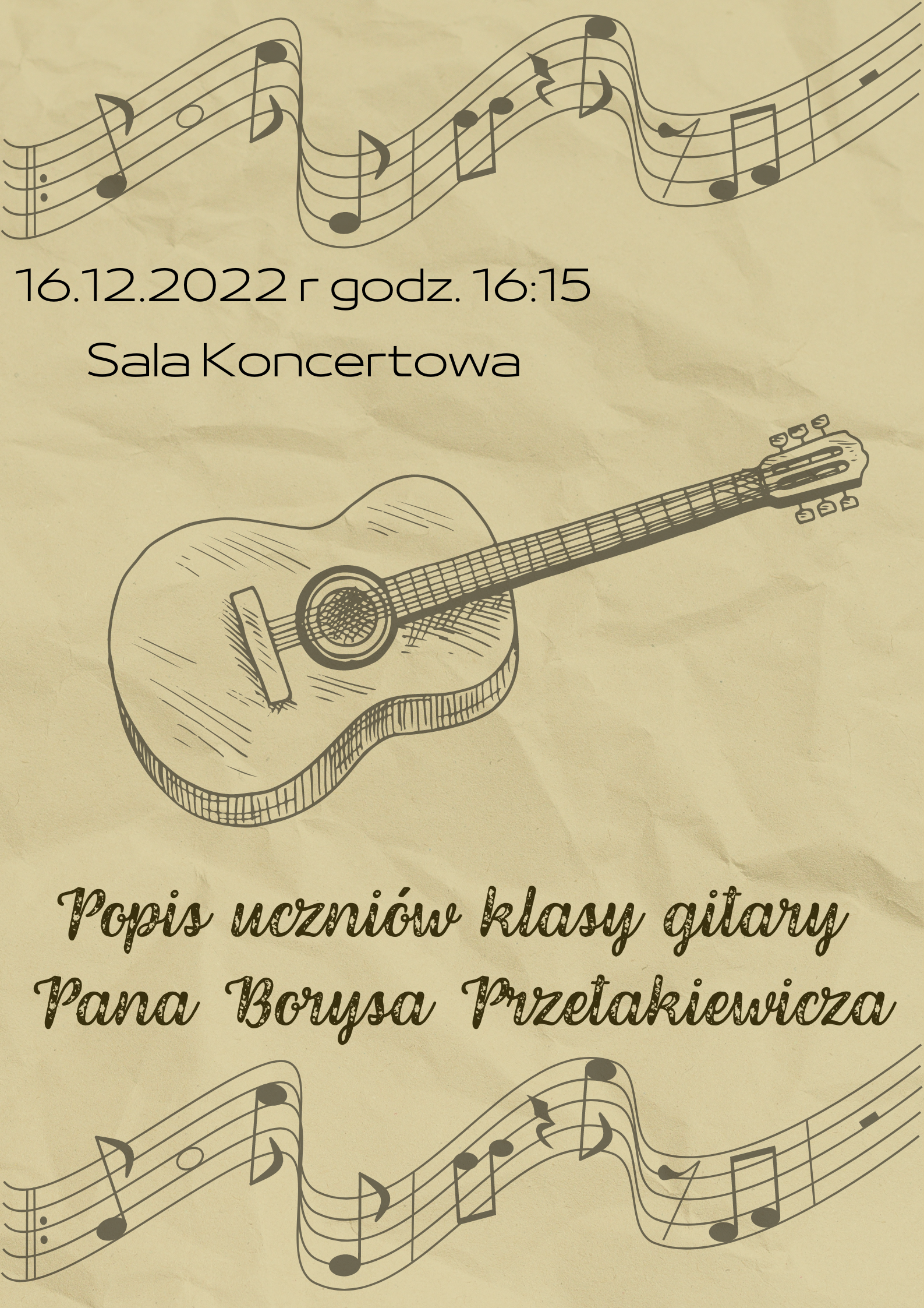Plakat o tle wyglądającym jak stara pognieciona kartka. Do góry i na dole plakatu znajduje się pięciolinia z nutkami. Pod górną pięciolinią znajduje się napis "16.12.2022 r godz. 16:15 Sala Koncertowa". Na środku plakatu gitara klasyczna, która jest narysowana ołówkiem. Pod tym napis "Popis klasy gitary Pana Borysa Przetakiewicza"