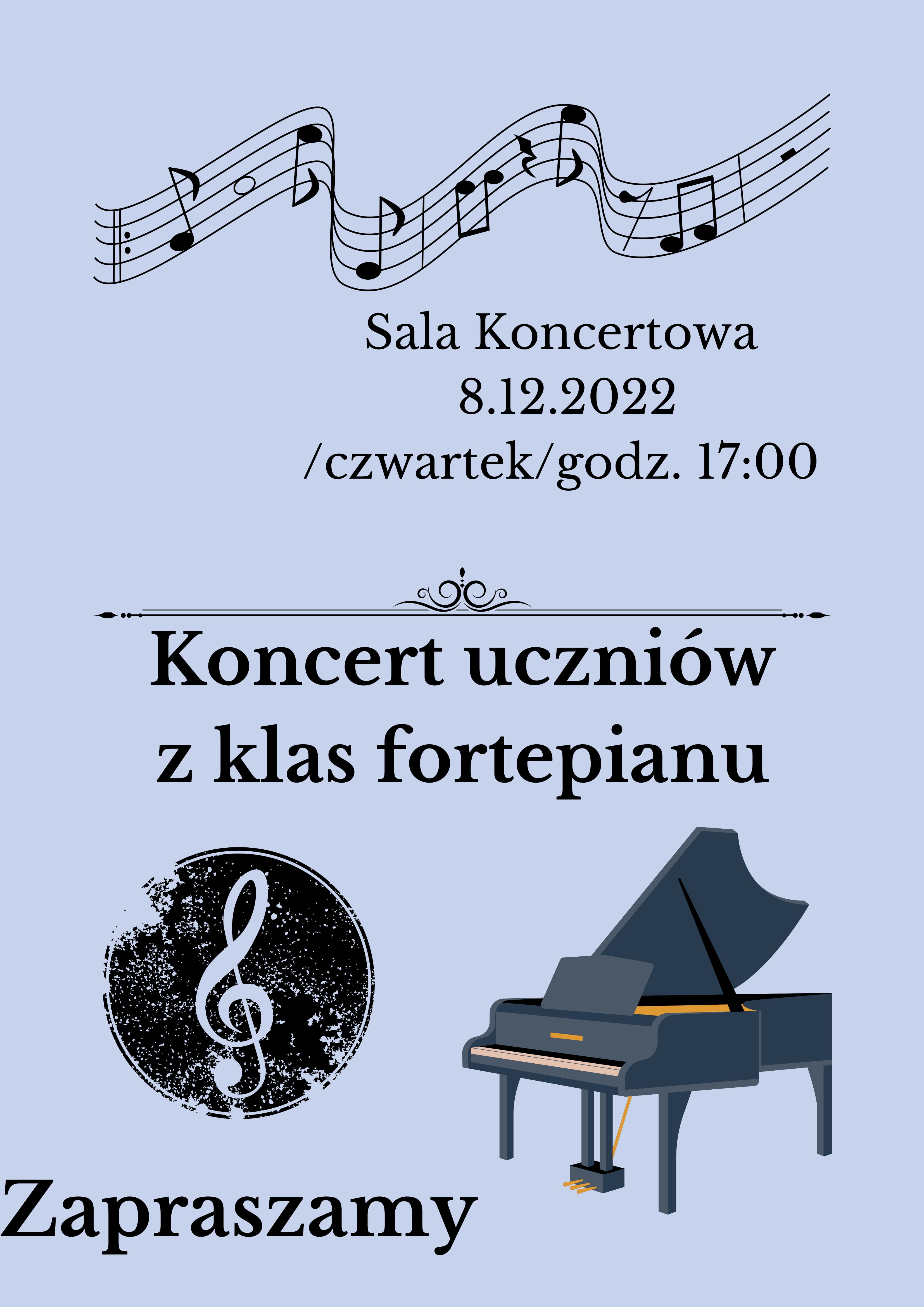 Grafika posiada jasnoniebieskie tło. Na górze znajduje się czarna pięciolinia z nutkami. Pod nią widnieje napis "Sala Koncertowa 8.12.2022 czwartek godzina 17".Pod napisem jest cienka czarna ozdobna linia, pod która jest napis "Koncert uczniów klas fortepianu". Poniżej po lewej stronie jest przezroczysty klucz wiolinowy otoczony czarnym kołem. Po jego prawej stronie jest granatowy fortepian, który ma otwartą górną klapę. Widać zdobienia w kolorze złotym. Na dole grafiki jest czarny napis "Zapraszamy"