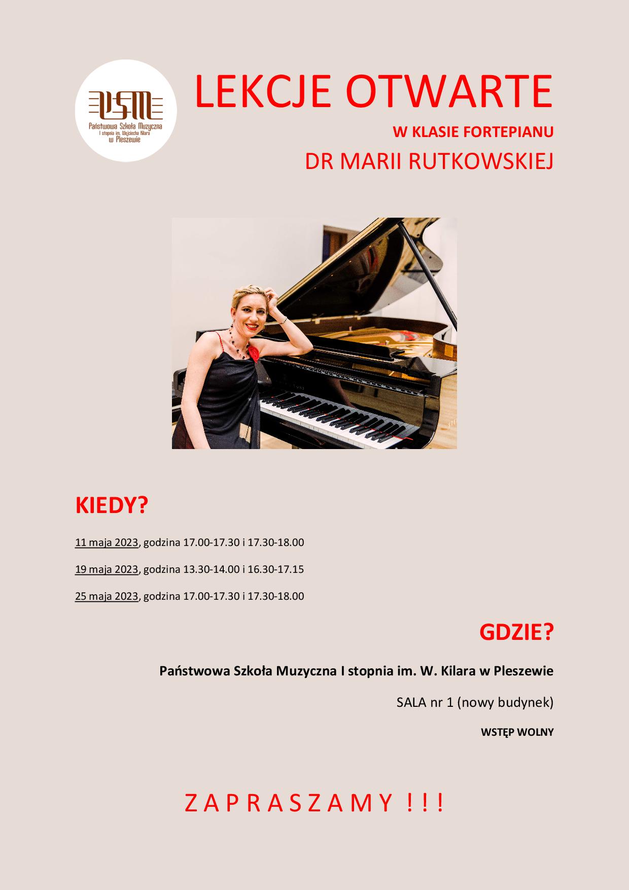 Jasne tło. Od góry w białym kółku brązowe logo PSM. Obok duży czerwony napis "Lekcje otwarte w klasie fortepianu dr Marii Rutkowskiej". Pod spotem zdjecie pianistki p. Marii Rutkowskiej, która jest oparta na fortepianie z otwartą klapą. Pod spodem szczegółowe informacje dotyczace lekcji otwartych.