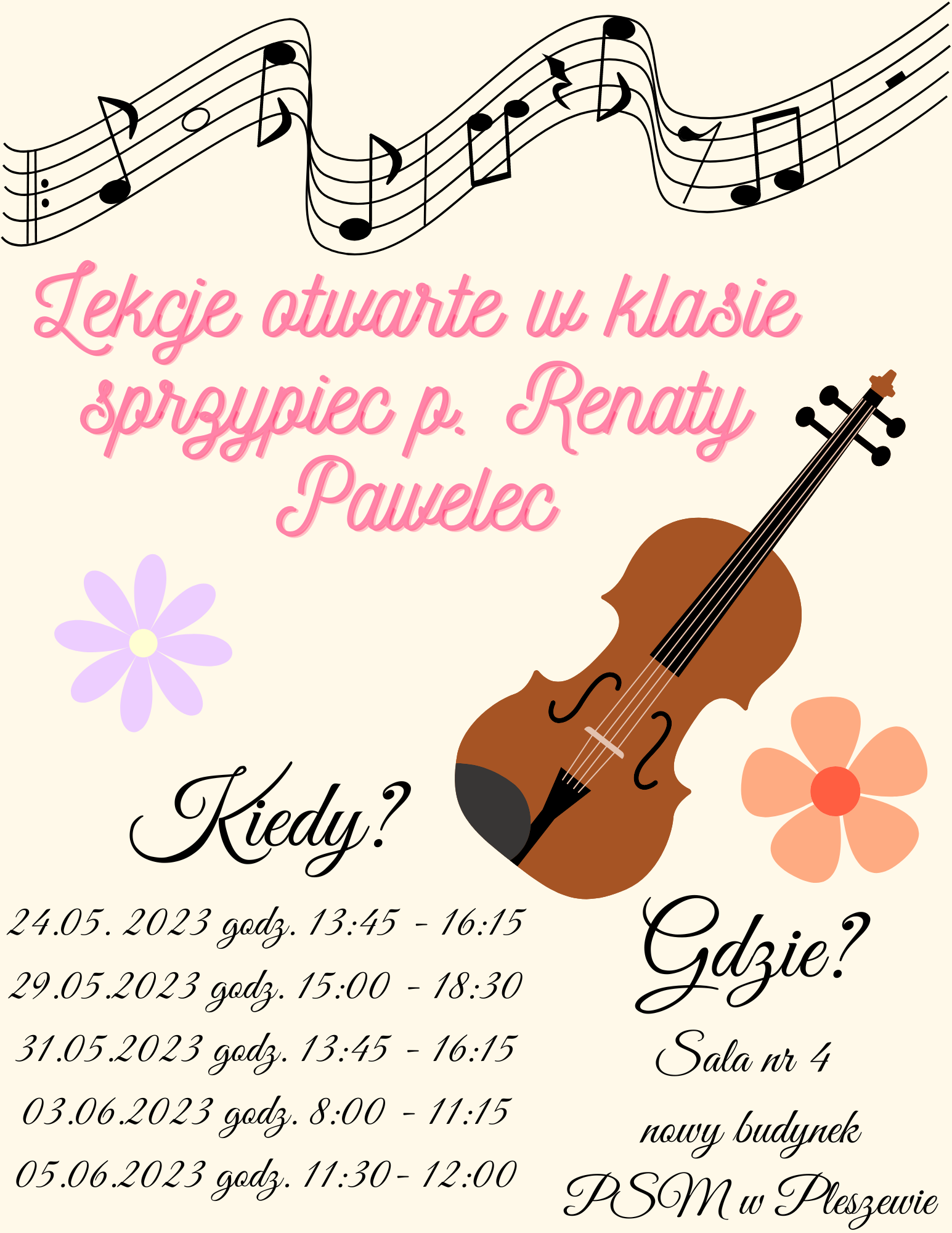 Jasnokremowe tło. Od góry pięciolinia z nutakmi. Pod tym różowy napis "Lekcje otwarte w klasie skrzypiec p. Renaty Pawelec" Obok brązowe skrzypce. Obok skrzypiec kolorowe kwiaty. Poniżej znajdują się szczegółowe informacje gdzie i kiedy.