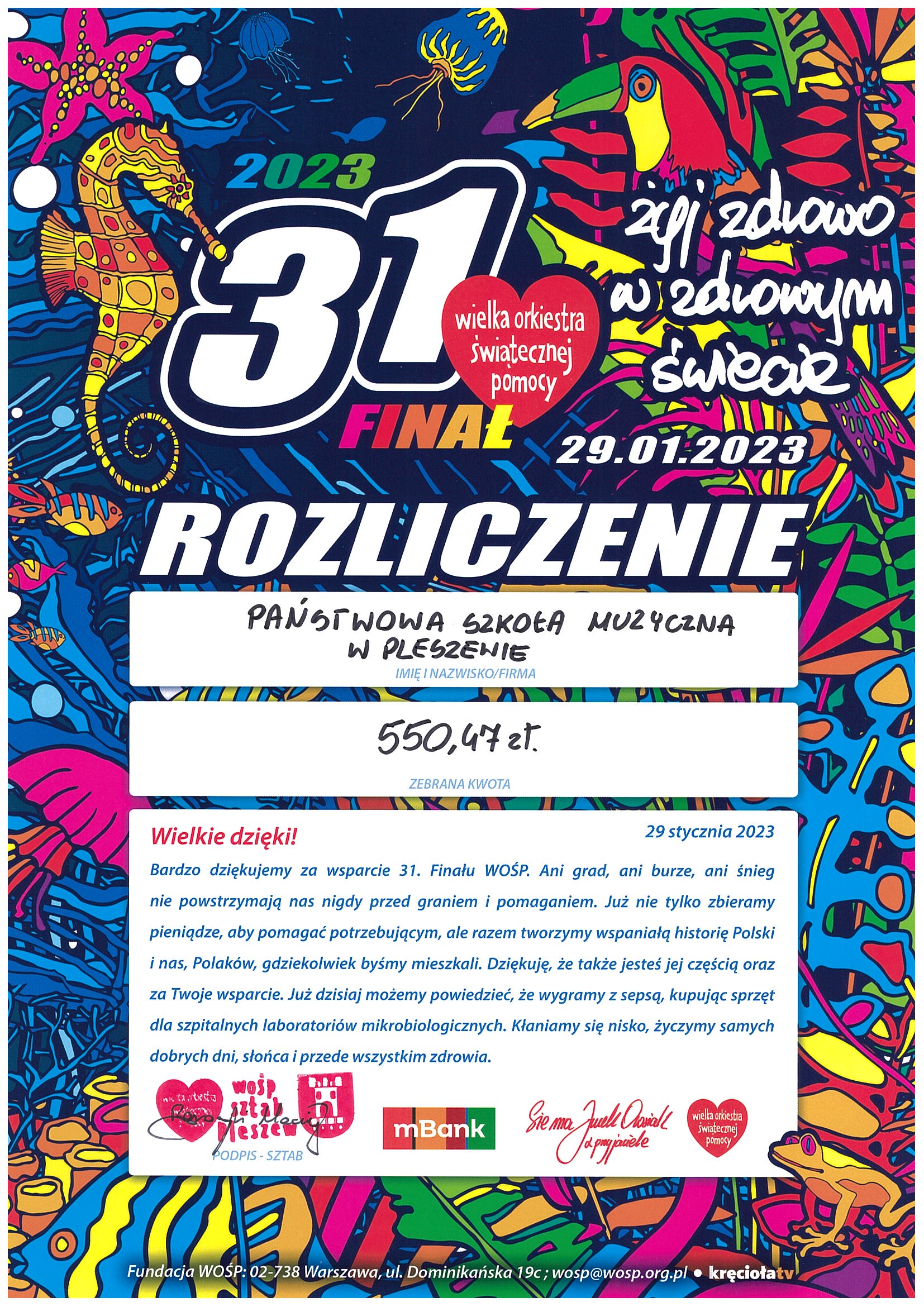 Kolorowa grafika, na której pokazany jest mozaikowy świat podwodny zwierząt morskich. Na górze Duża liczba "31", gdzie przy jedynce znajduje się czerwone serce z napisem "Wielka Orkiestra Świątecznej Pomocy" i pod spodem kolorowy napis "FINAŁ". Obok napis "Żyj zdrowo w zdrowym świecie" i data "29.01.2023" Pod tym Duży biały napis "Rozliczenie". Grafika przedstawia kto i ile zebrał na WOŚP oraz podziękowania. Na dole logo wośp sztab pleszew, m-banku, podpis Jurka Owsiaka i serduszko WOŚP. Na samym dole biały napis zawierający adres fundacji WOŚP.