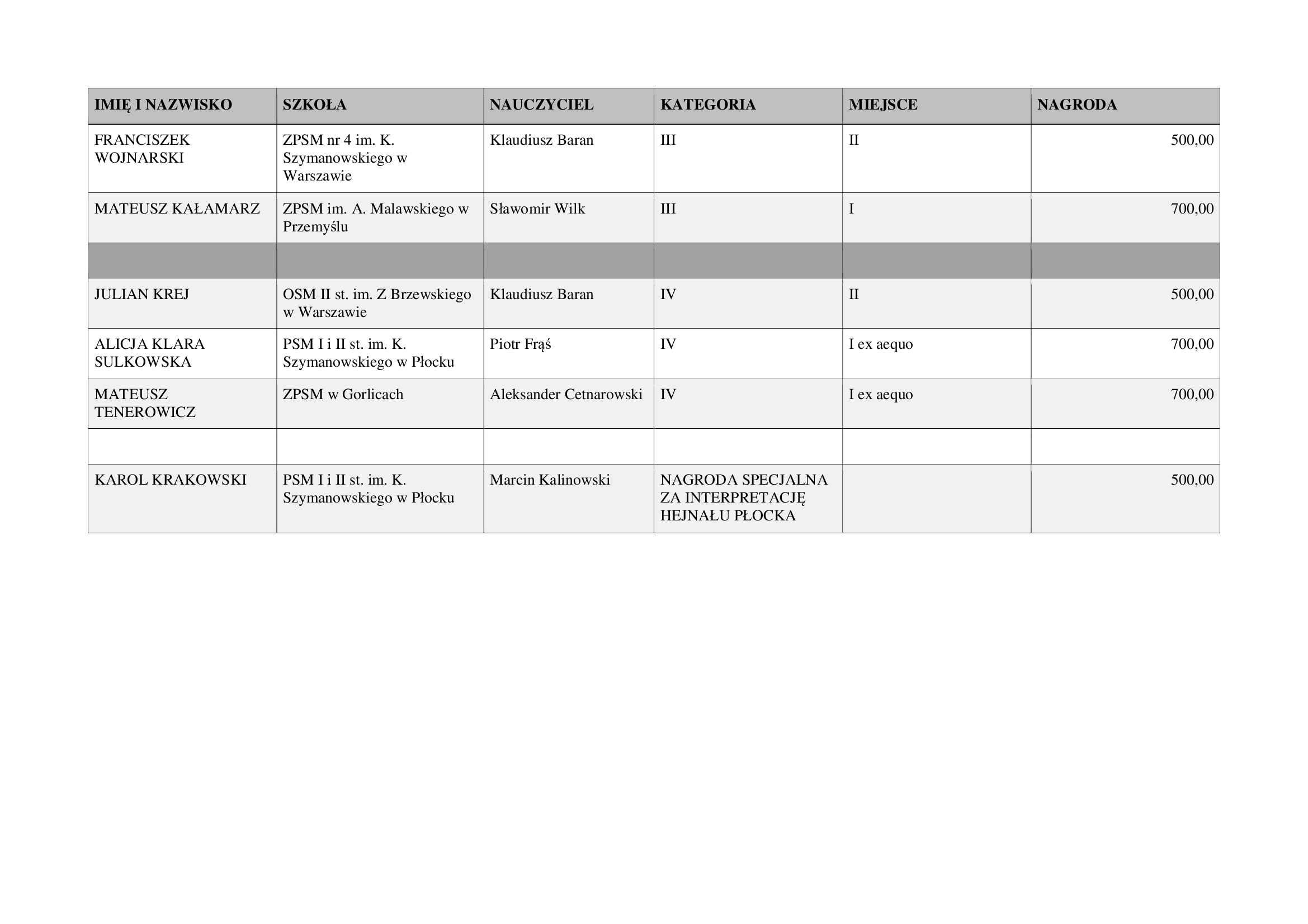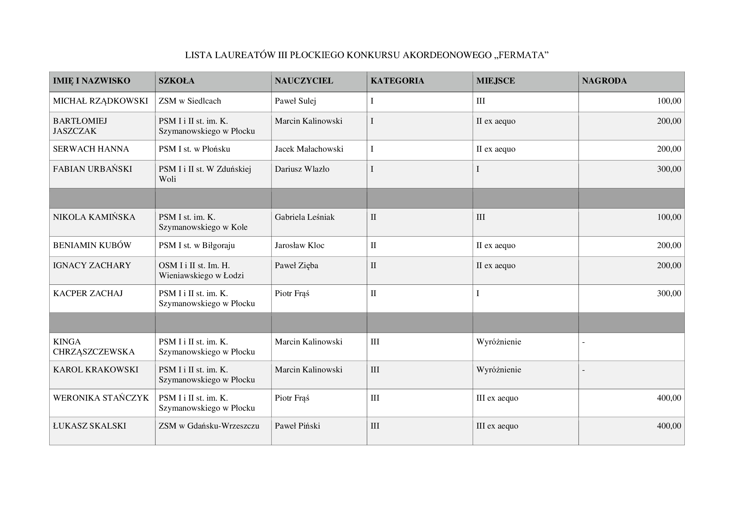 Laureaci III Płockiego Konkursu Akordeonowego „FERMATA” proszeni są o wypełnienie formularza „Dla nagrodzonych”, aby można było dokonać przelewu nagrody finansowej. Skan wypełnionego i podpisanego dokumentu prosimy odesłać na adres mailowy: fermata@psmplock.pl