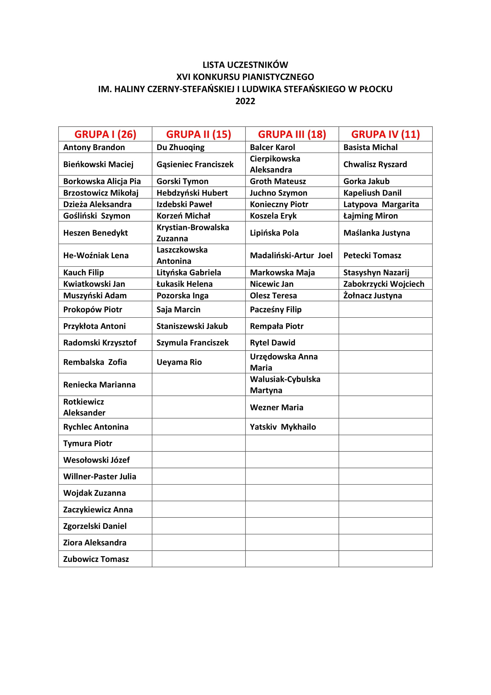 LISTA UCZESTNIKÓW XVI KONKURSU PIANISTYCZNEGO IM. HALINY CZERNY-STEFAŃSKIEJ I LUDWIKA STEFAŃSKIEGO