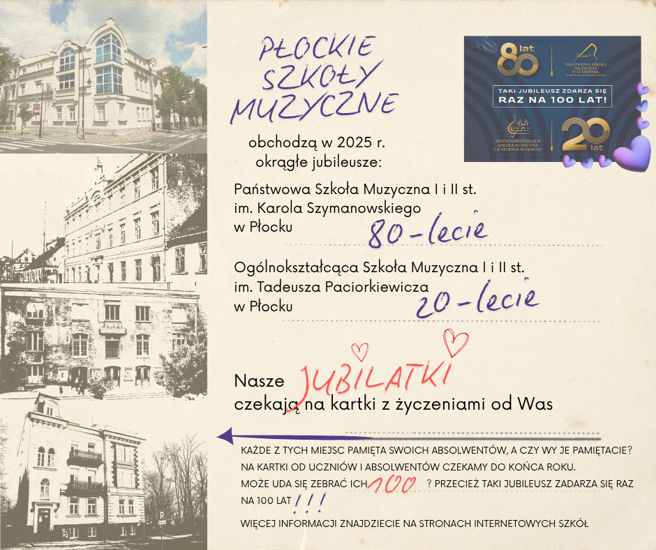 Świętowania Jubileuszu nie chcemy kończyć 17 października, dlatego zapraszamy wszystkich UCZNIÓW, NAUCZYCIELI, PRACOWNIKÓW, ABSOLWENTÓW i PRZYJACIÓŁ płockich szkół muzycznych o WYSYŁANIE KARTEK Z ŻYCZENIAMI DLA NASZYCH SZACOWNYCH JUBILATEK - wszak 80. + 20. = 100!!!