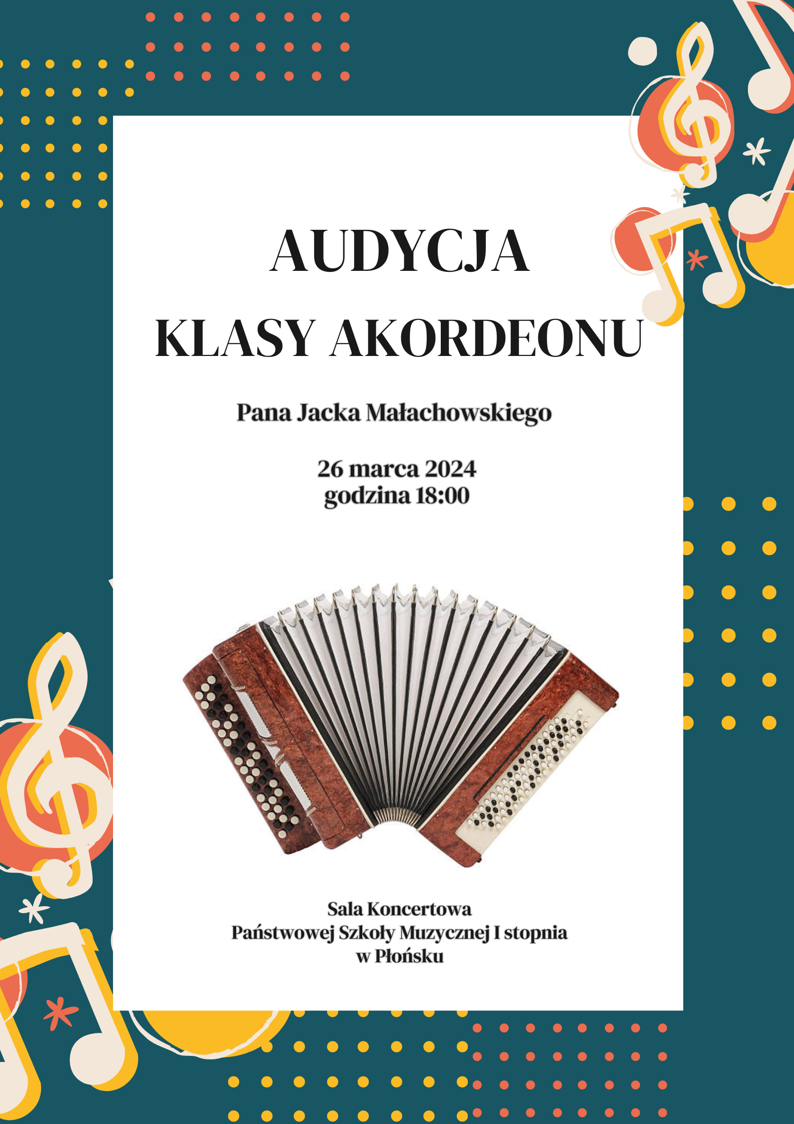 Serdecznie zapraszamy na Audycję klasy akordeonu Pana Jacka Małachowskiego, która odbędzie się 26 marca 2024 roku (wtorek) o godzinie 18:00 w sali koncertowej Państwowej Szkoły Muzycznej I stopnia w Płońsku.