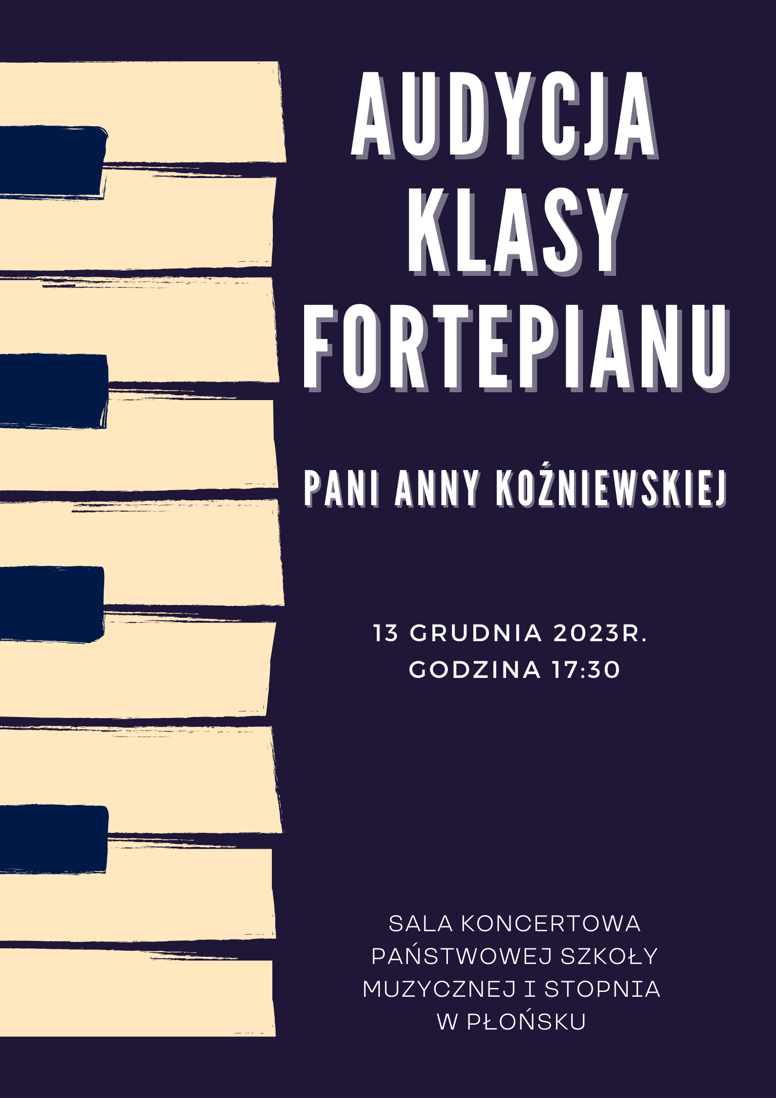 Serdecznie zapraszamy na Audycję klasy fortepianu Pani Anny Koźniewskiej, która odbędzie się 13 grudnia 2023 roku (środa) o godzinie 17:30 w sali koncertowej Państwowej Szkoły Muzycznej I stopnia w Płońsku.