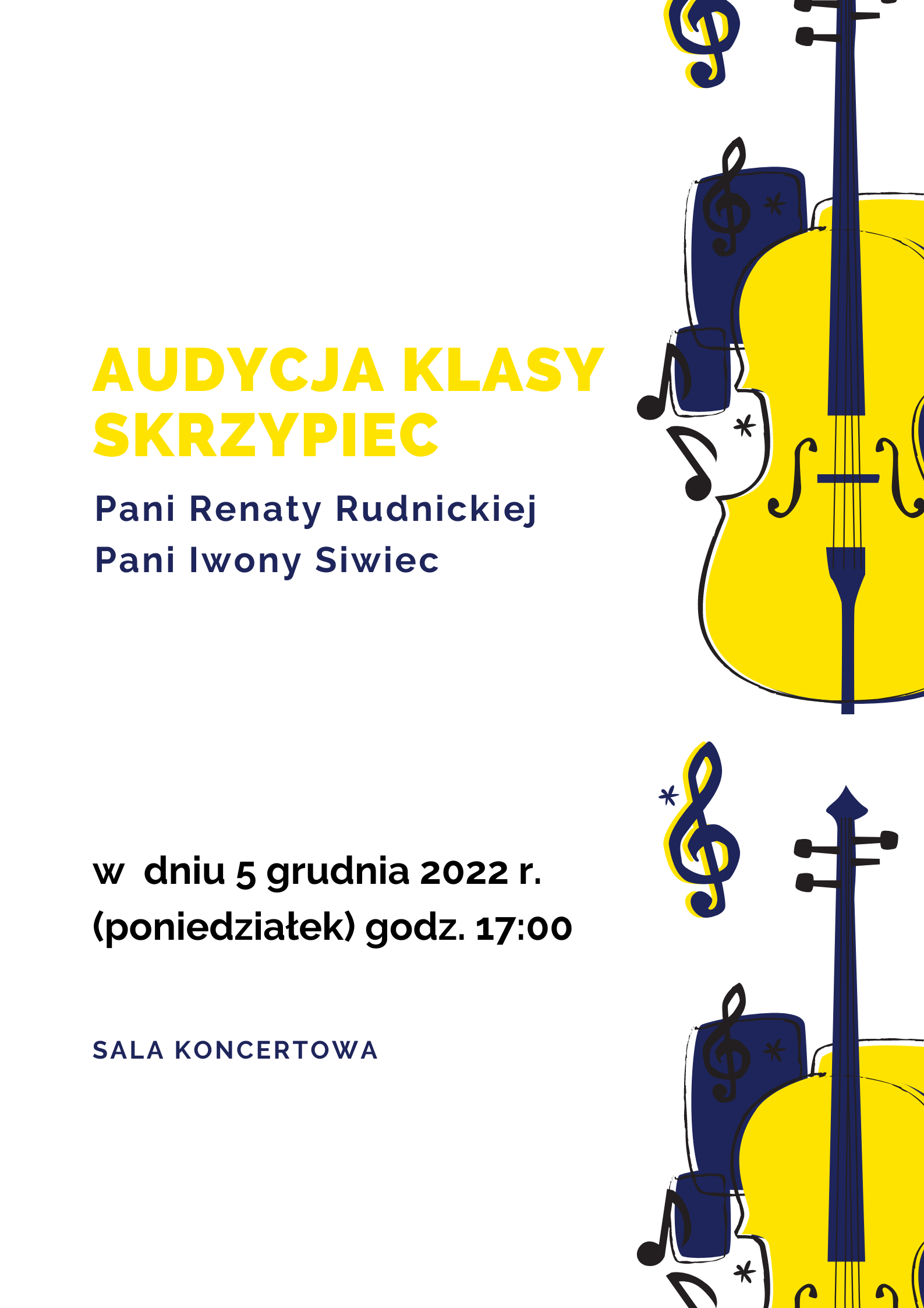 Zapraszamy na audycję klasy skrzypiec Pani Renaty Rudnickiej, Pani Iwony Siwiec 05.12.2022. godz. 17:00, Sala koncertowa.